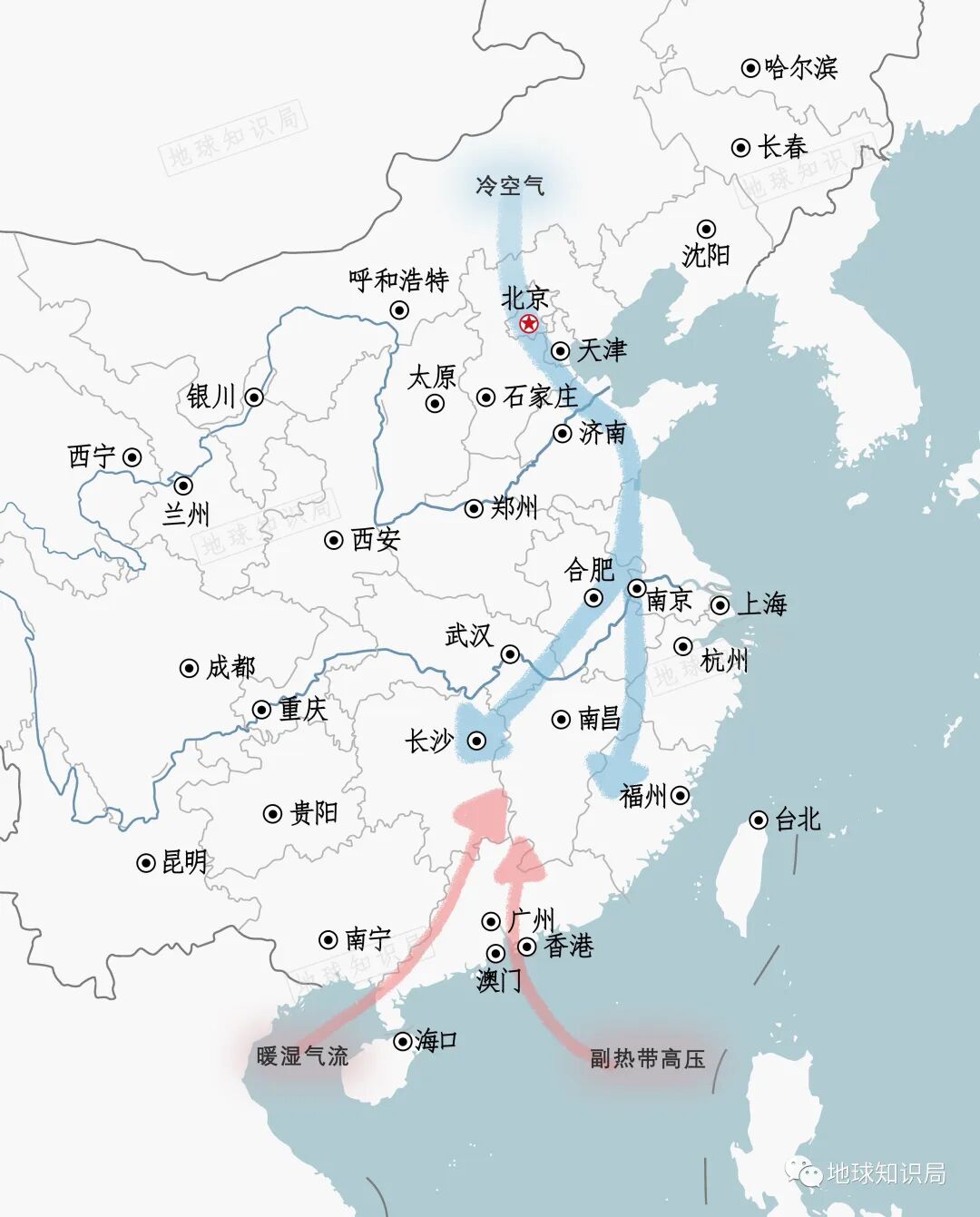 同时,在5月下旬至6月上旬时,冷空气活动依然能深入到华南,尽管大多数已相当微弱。在夏季风初爆发时,冷暖气流得以在华南势均力敌,长期交汇形成锋面降水。