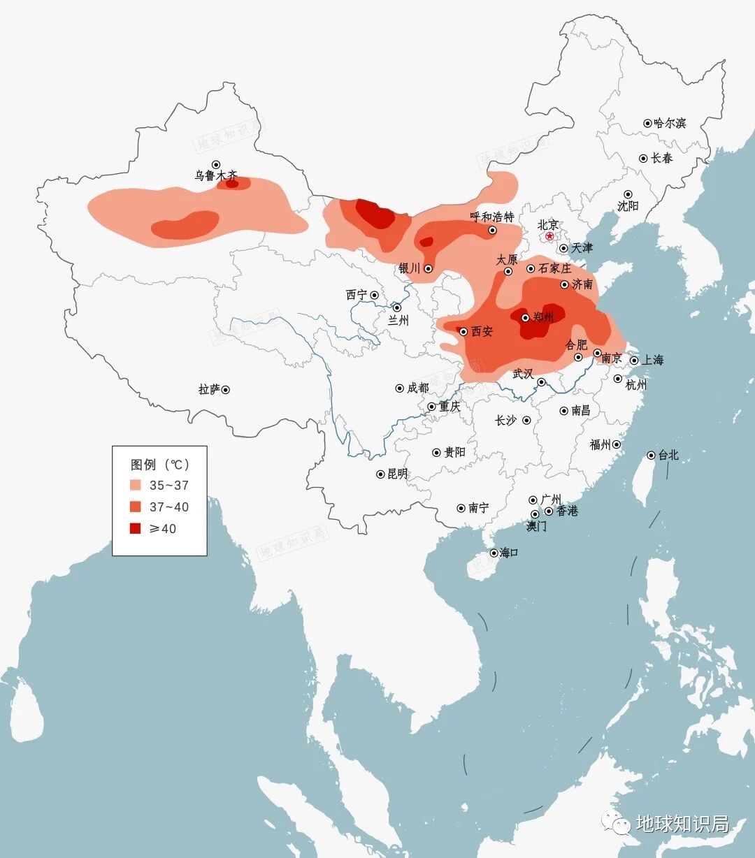 与持续东进、南下的暖高压相伴随,热浪从西向东、从北向南蔓延,山西、河南、山东及苏皖、关中盆地等地区出现持续性高温天气,日最高气温预计有35~38℃,局部地区可达40℃左右。河南中部形成高温中心,郑州、漯河等地将会持续一周39-40度的高温天气。20-21日暖脊控制了华北,北京市最高气温可达35-36℃,空气湿度大,体感闷热。