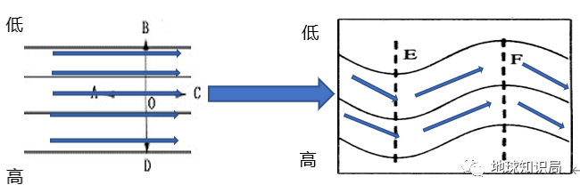 (左图为平直的西风带,右图为发生扰动后形成的槽脊)▼