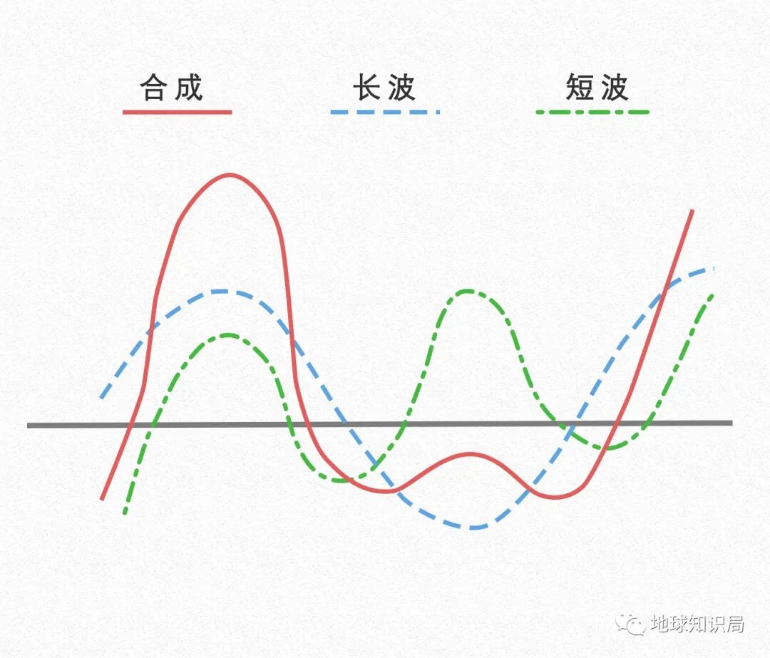 这里我们可以将西风带上的波动进行分解,在不同的尺度上讨论问题。短波生命周期较短,移动较快,长波则生命周期较长,移动相对缓慢,一般对气压图做5天-10天的平均,就就可以看到,西风带波动中时间和空间尺度较小和较大的两部分,这其中长波尤其重要。