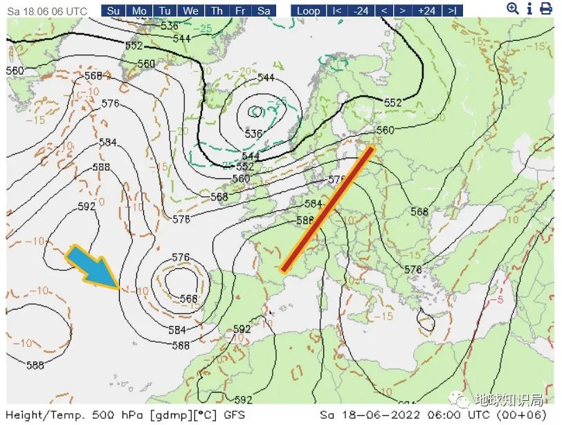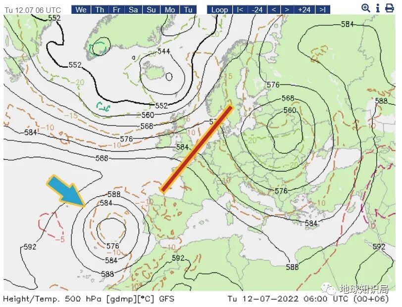 但是“切断低压”的位置非常要紧,比如在欧洲,“切断低压”长时间待在伊比利亚半岛以西的洋面上。旁边的陆地则被不断加强的高压脊控制,所以晴朗少雨。