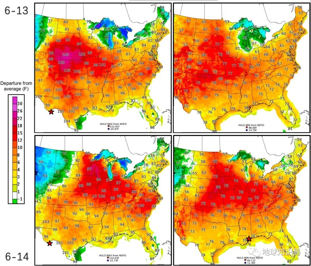 在北美,6月13日,美国多个城市刷新了高温记录,全美超过三分之一的人口受到影响。热浪在7月初再次来袭,美国中部和西南部多个城市打破高温记录,有的甚至比最高温度高出6℃之多。