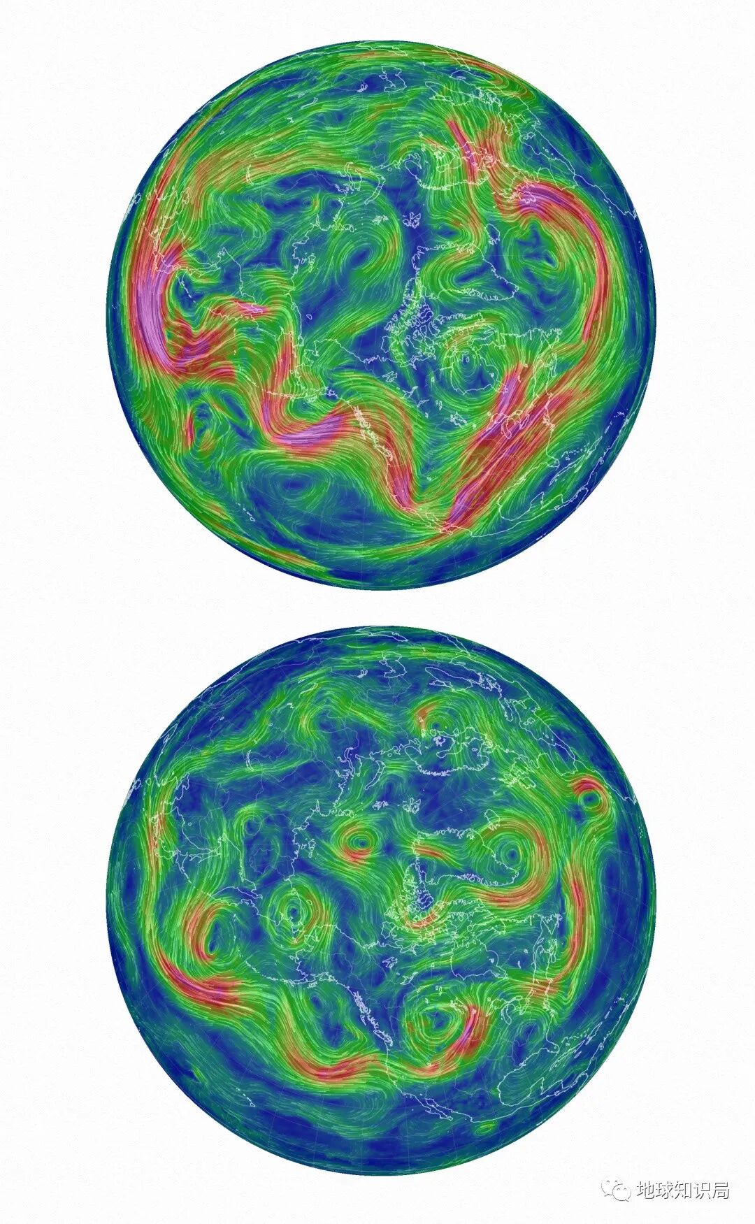 赤道的炎热和极地的寒冷之间的温度差,导致高空的空气从赤道流向极地,并在地转偏向力的作用下造就了强劲的西风走廊,气体以110km/h(相当于30.6m/s)的速度绕行整个地球。这条西风带并不总是平直的,常常受到高大山脉的阻挡和南北冷暖空气的入侵而南北波动,实际上呈现为一条蜿蜒曲折的风带。