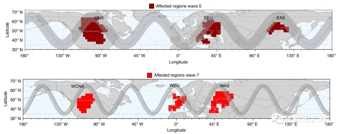 这就造成了北半球不同经度上相隔几千甚至几万公里会同步产生热浪和洪水。今年6月份东亚、欧洲和北美地区同时发生的热浪就和这个机制相关。类似的,2018年夏天北美、西欧和里海地区发生热浪,东南欧和日本同时发生了暴雨,也跟西风带波动结构相关。