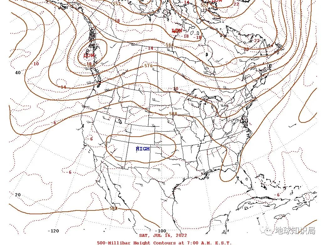 而在美国那边,6月中旬和7月以来,西风带波动形成的高压脊控制着美国大部。持续的晴朗天气让高温迅速发展开来。