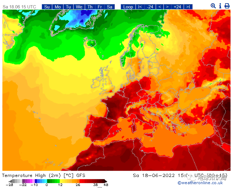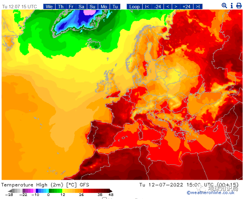 更严重的是,“切断低压”会像发动机一样源源不断地将北非炎热的空气拉向北方。西欧地区自然会温度飙升。7月中旬“切断低压”和高压脊的模式和6月如出一辙,西欧也再次迎来热浪。