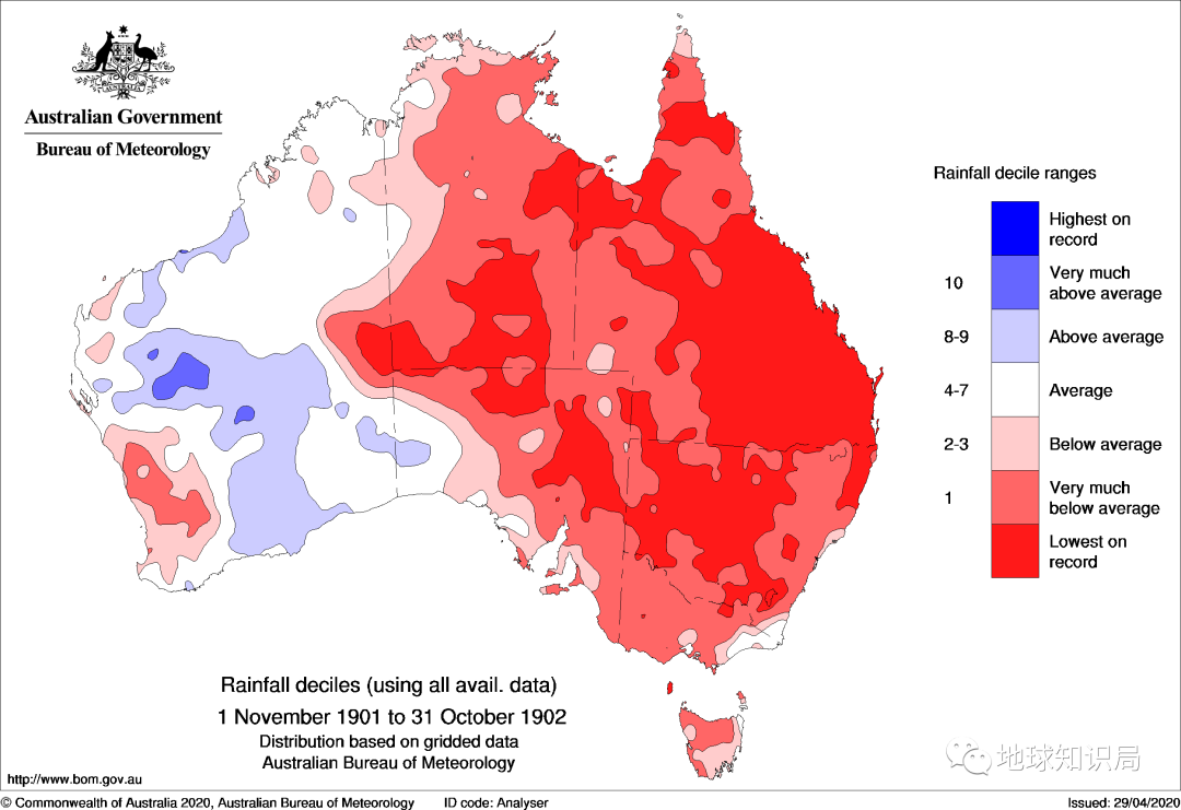 受厄尔尼诺和正印度洋偶极子(相当于印度洋上的厄尔尼诺)影响,2019年成为澳大利亚有记录以来最热、最干燥的一年。当年的平均降雨量仅277 毫米,是1900年以来记录到的最低水平。