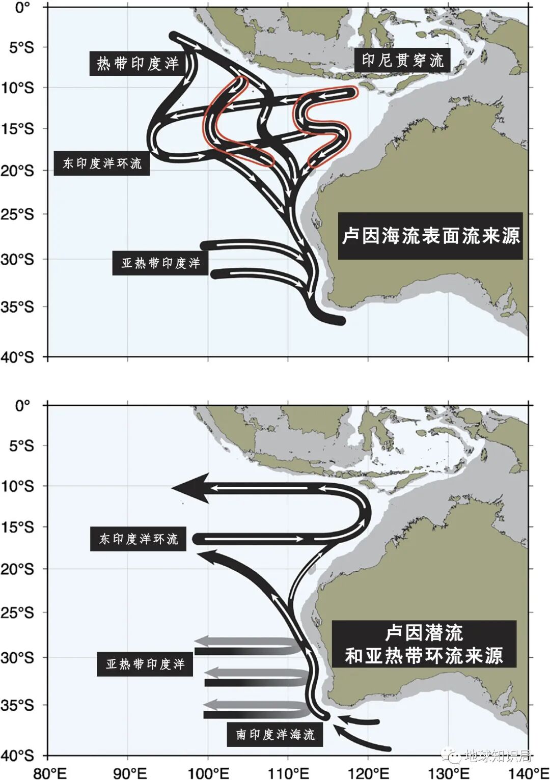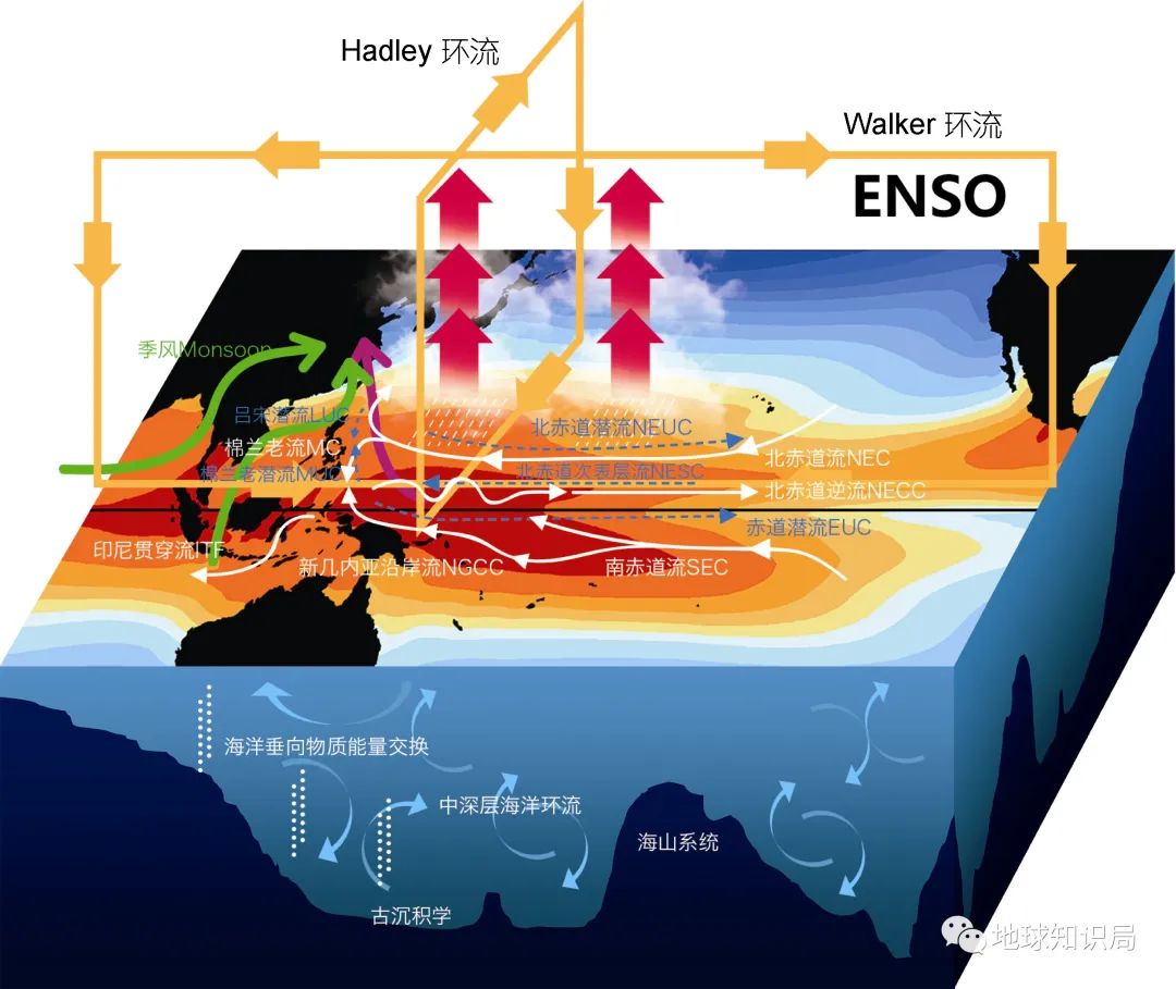 这还得从澳大利亚北侧的海域说起。在热带盛行的信风吹拂下,太平洋表层温暖的赤道流一路向西,在印度尼西亚群岛一带受阻堆积,形成全球范围内面积最大、温度最高的暖水体——西太平洋暖池。这其中一部分洋流可以通过印尼群岛间的海道进入印度洋,称为印度尼西亚贯穿流。