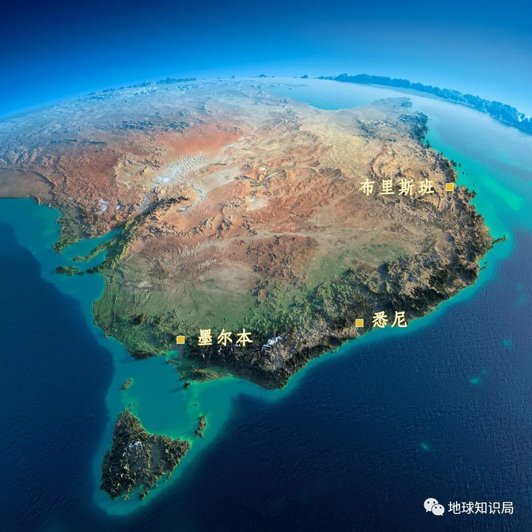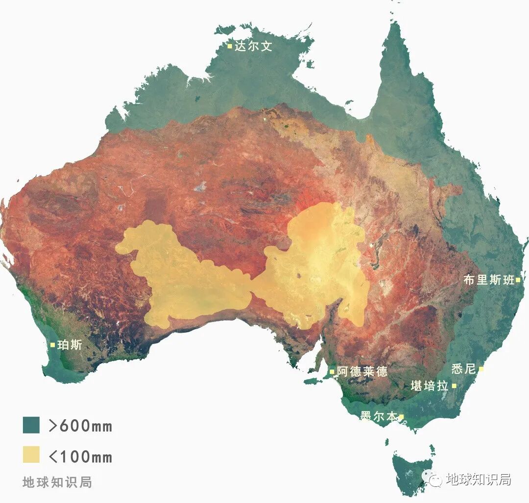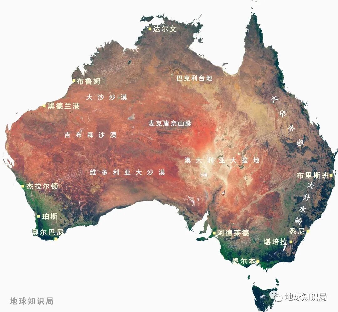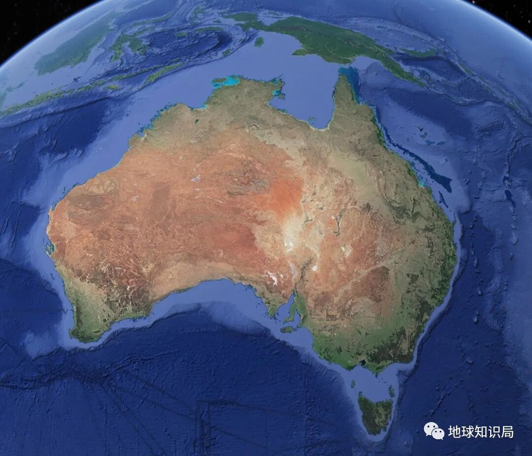 从卫星上来看,澳大利亚的陆面呈现出红色,与火星地表极为相似而异于地球上的其他大陆,整体看来宜居条件确实不太行。
