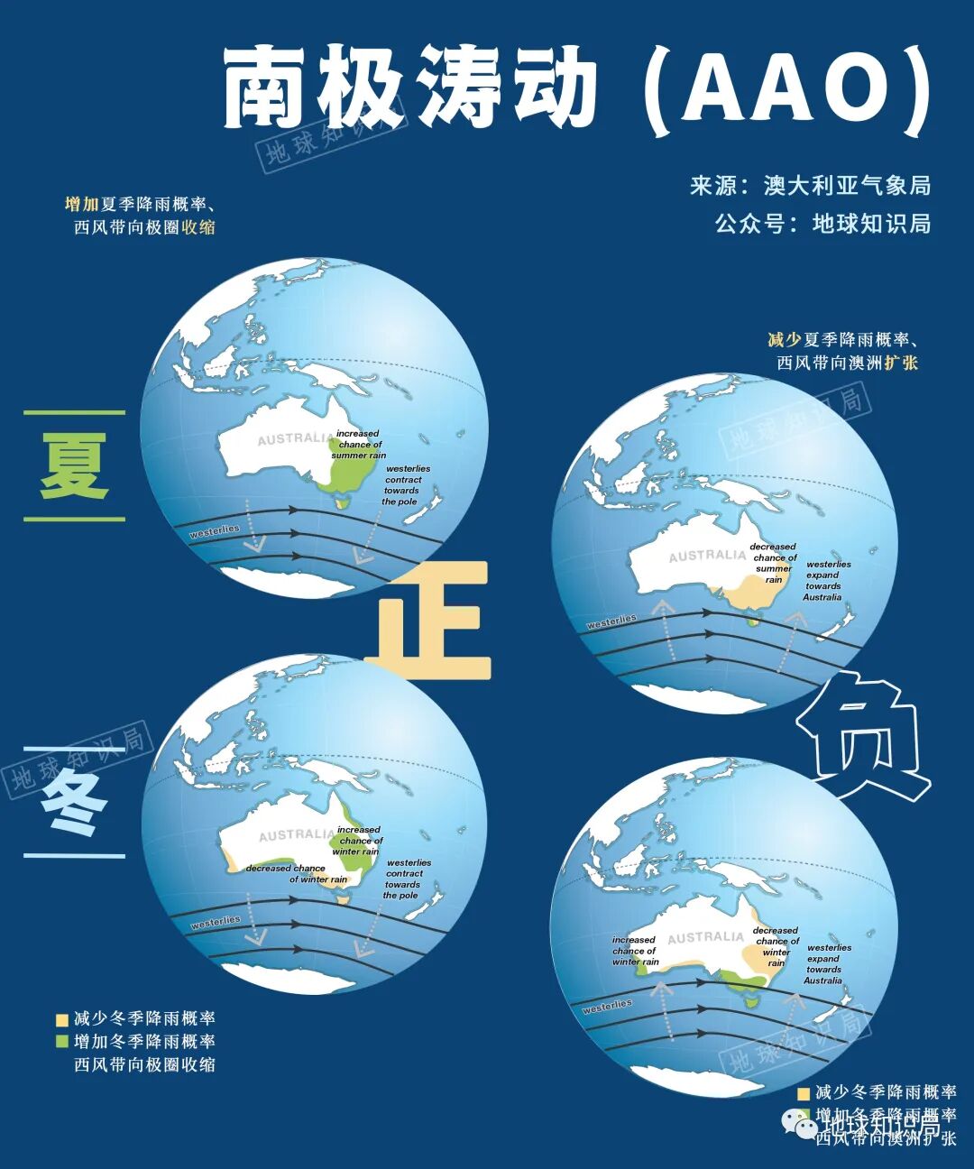这一模态的正负位相变化引起西风带和高压脊的南北移动,极大影响了澳大利亚的气候情况: