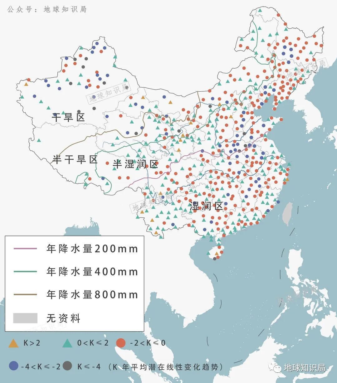 结合降水的变化来看,在一些这四五十年来变得更“湿润”站点,降水量的增加和潜在蒸散量的减少加在一起在最多也不会超过200毫米,更多的地方可能只有几十毫米。而要达到“湿润”标准,降水量至少要达到潜在蒸发量65%。