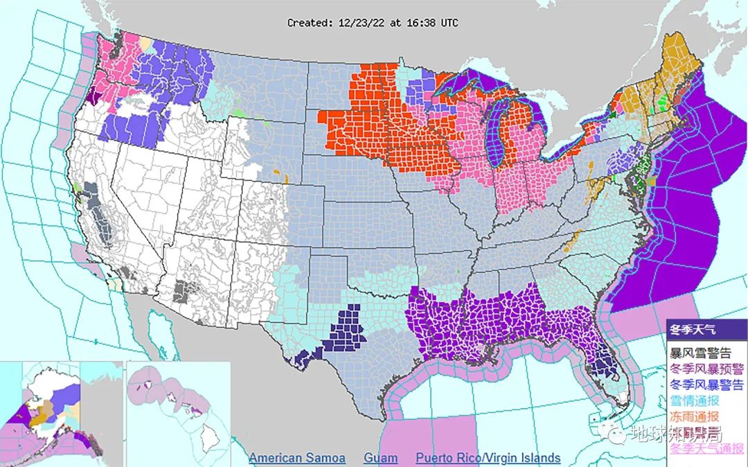 (12月23日的NWS 监视、警告、咨询地图 图: NOAA)▼