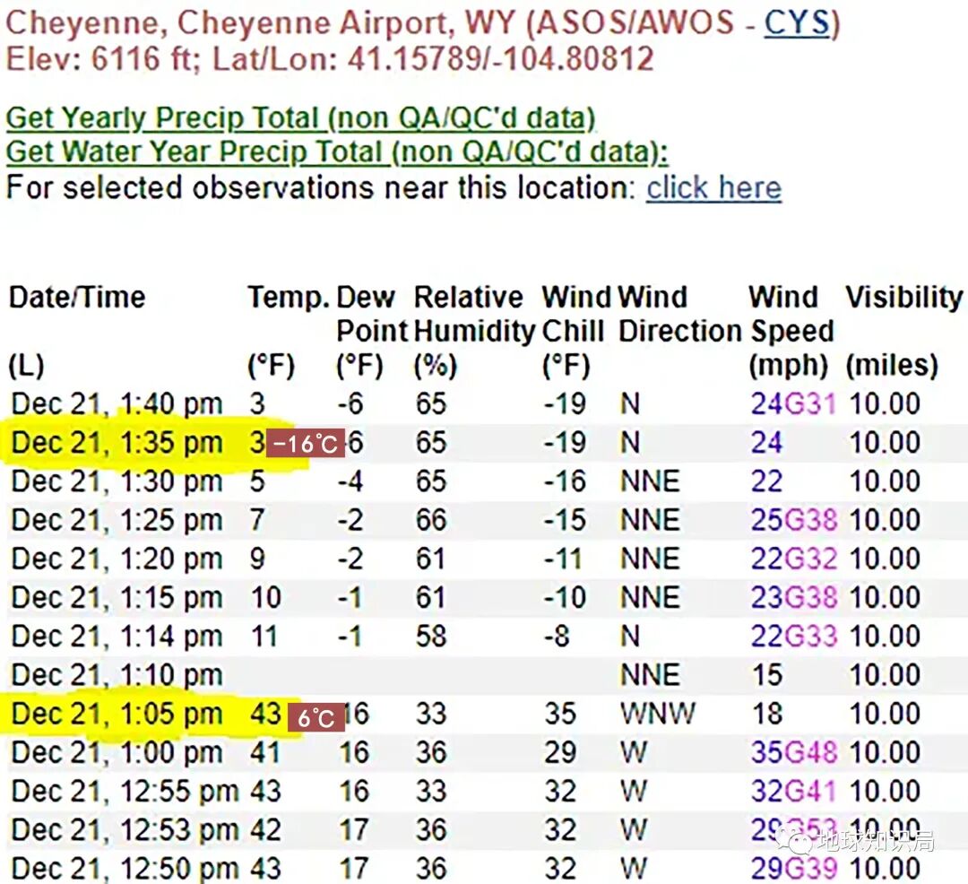 早在当地时间12月21日下午1:05到1:35,随着北极冷空气降临大平原,怀俄明州首府夏延市的气温半小时内暴跌22℃,破纪录的从6℃降至-16℃。