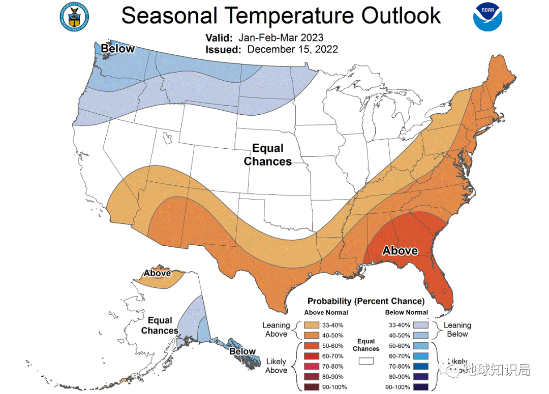 而从 NOAA 最新发布的美国2023年1月至3月的官方气温预报来看,明年美国南部偏暖的可能性更高。