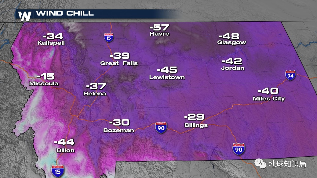 而22日蒙大拿州多地气温大多在-32~-49℃,位于约翰·史蒂文斯峡谷的海拔2100多米的气象站甚至记录到了-56℃的极端低温。