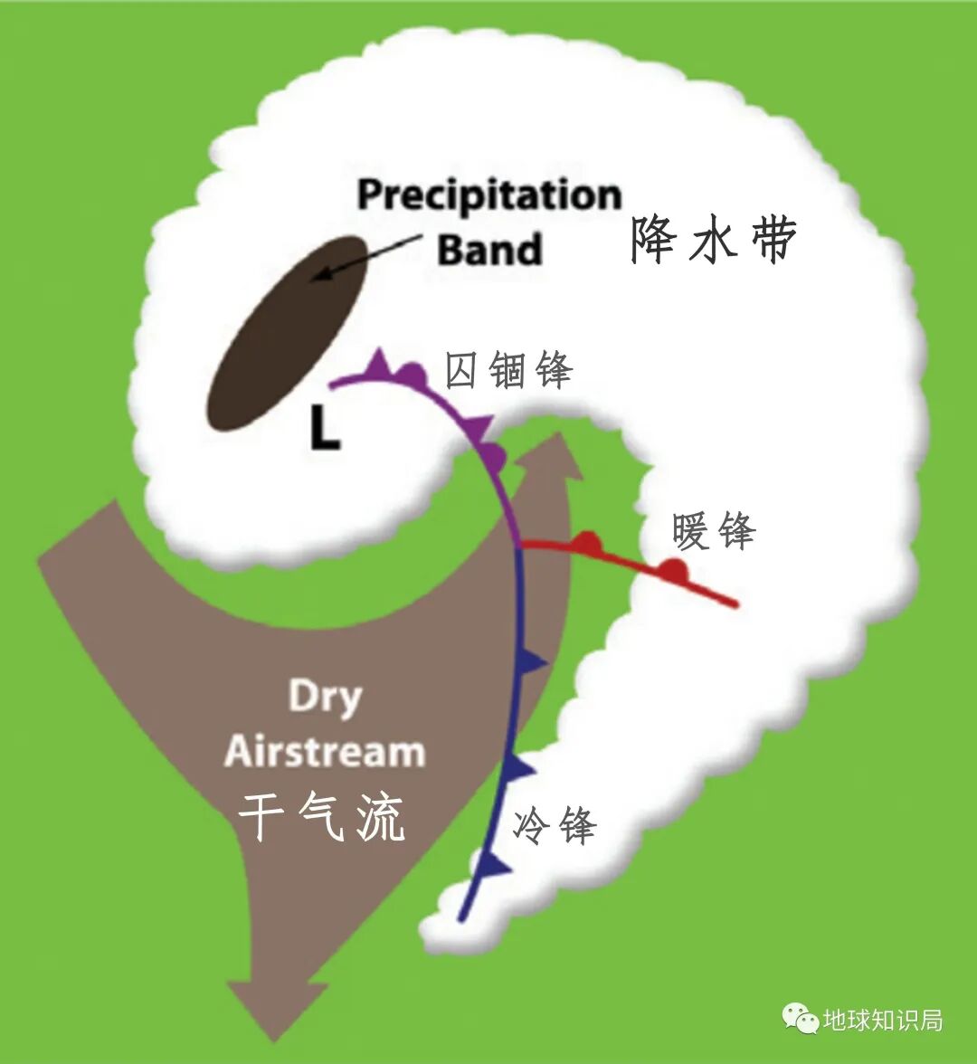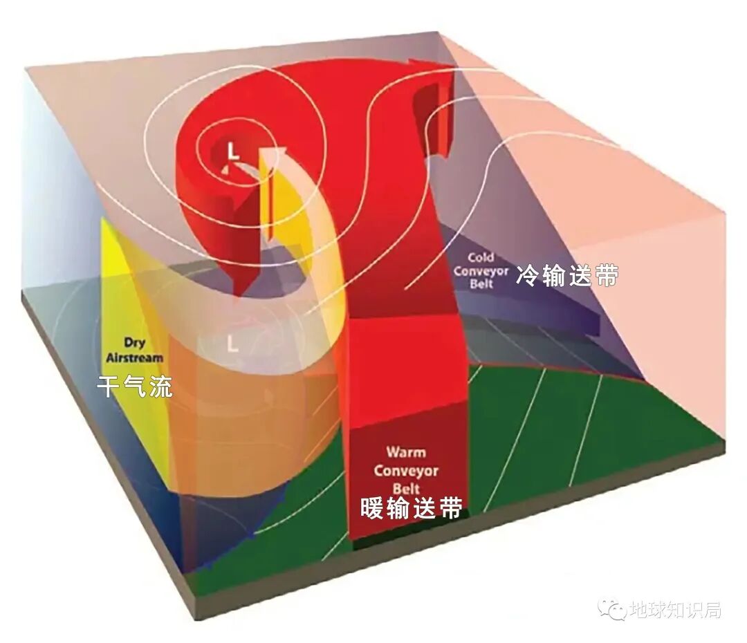 温带气旋的结构可由“三条带”简单总结,也就是气旋内部主要存在三股气流: