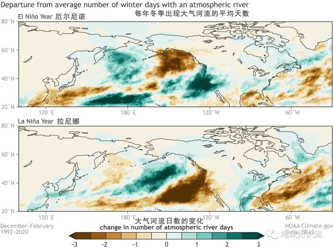 研究表明,在我国东部地区与大气河,在厄尔尼诺年的冬季,我国东部地区的降水偏多,其中60%的变化是增加的大气河发生频率导致的,可能造成暴雪灾害的极端降水的变化亦是如此;拉尼娜年则相反,东部地区总降水和极端降水都偏少,其中大气河变化的贡献举足轻重。