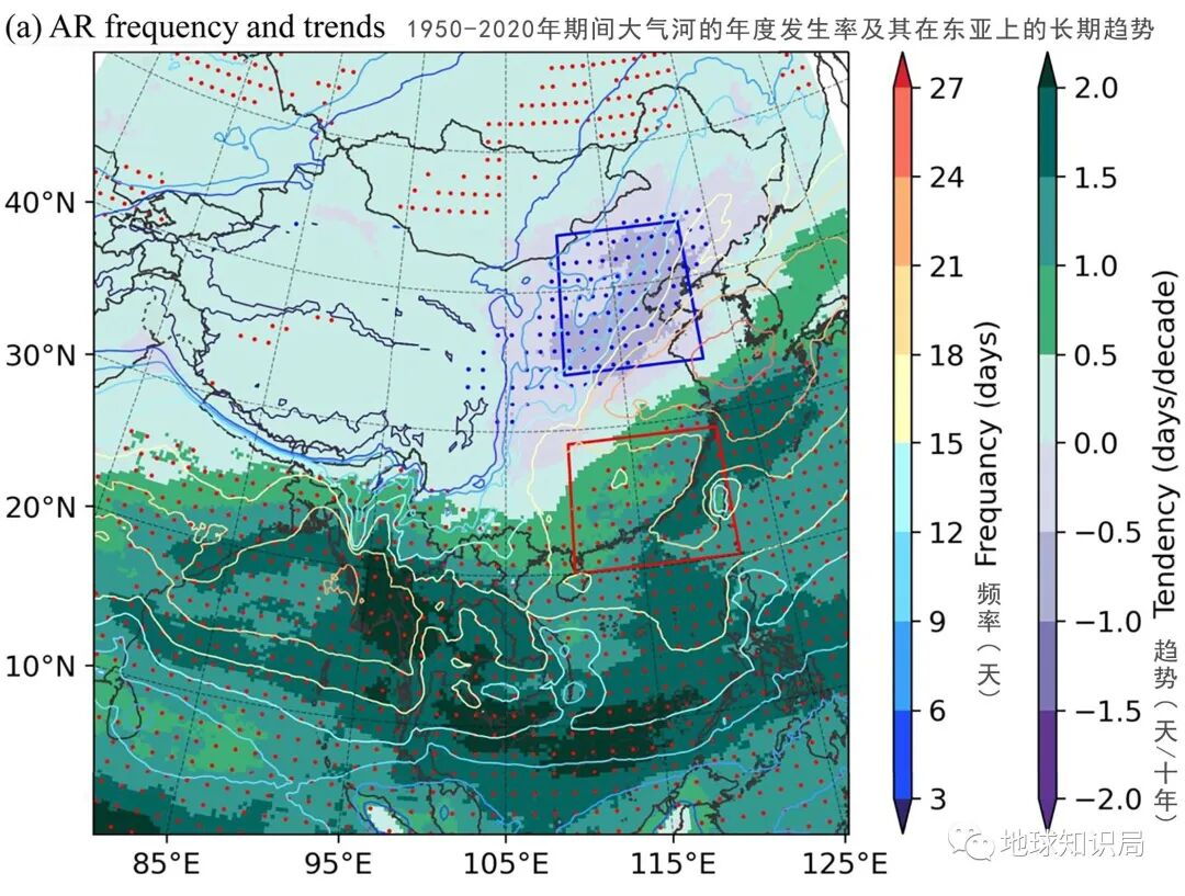 过去70年来,中国长江以南地区的每年有越来越多的大气河发生,华北地区却越来越少。具体而言,长江以南地区在本世纪10年代发生大气河的年平均日数已经比上世纪50年代增加了9-12天,华北地区则增加了3-6天。