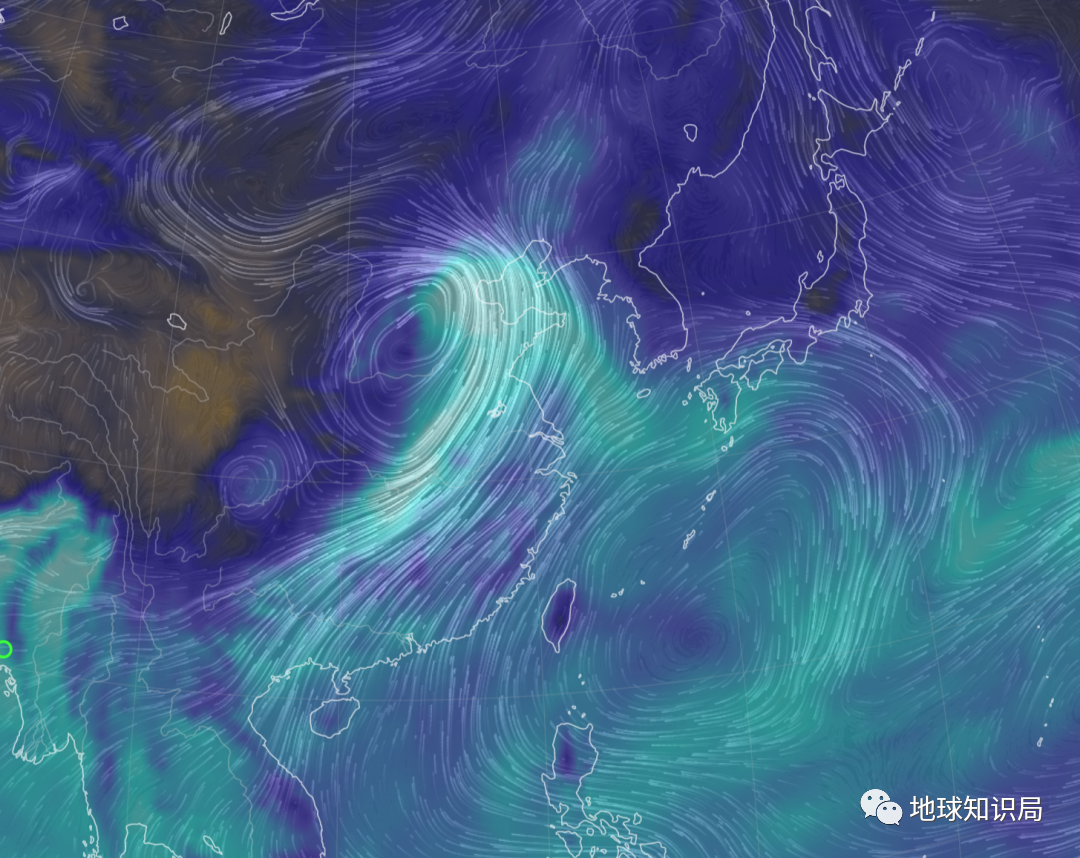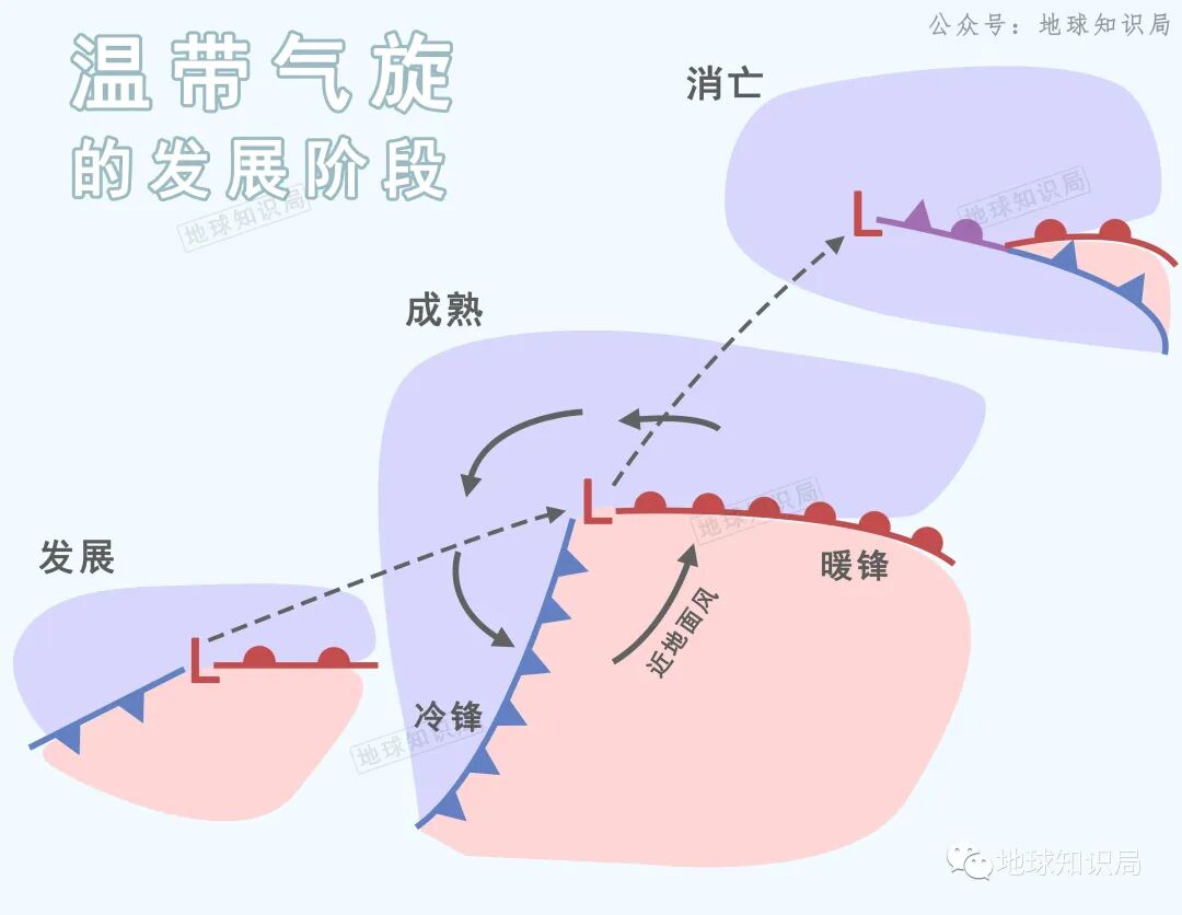 三股气流螺旋交汇,容易形成“逗点云系”,在卫星云图中一目了然。“逗点云系”席卷了干冷和暖湿空气,在交界地方温度变化剧烈形成锋面,干冷气流的一侧不易成云降雨,暖湿气流一侧则被云覆盖。