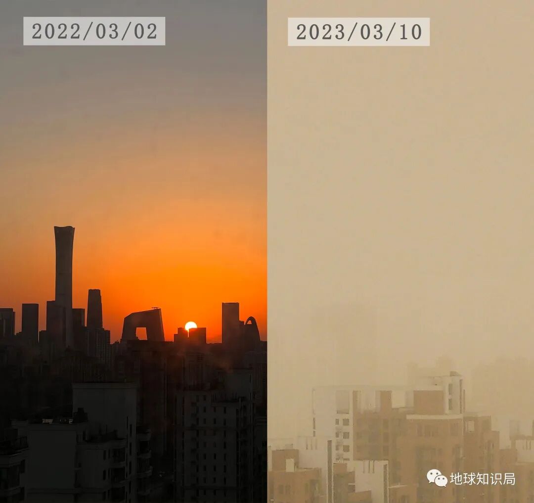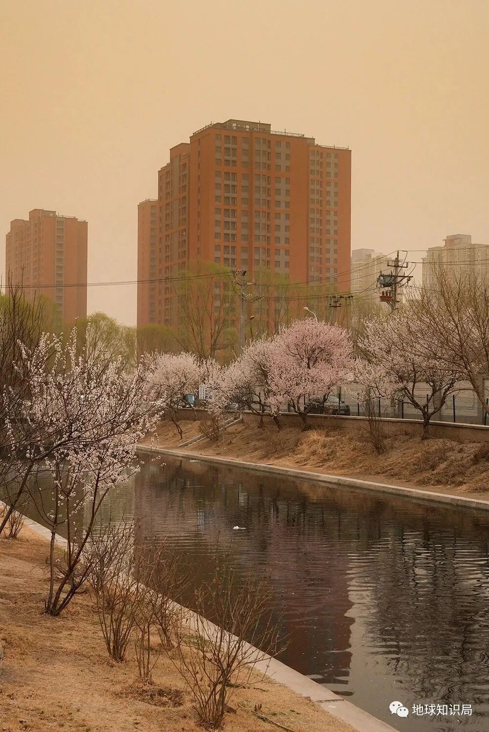 冷气团抵达中国后,将南方暖气团与被“晒热”的冷气团挤逐渐挤压到长江沿线一代,来自蒙古国的尘被刮到北京。而黄河几字湾周边因为有就近的沙源,所以表现为强沙尘暴,而北京等华北城市,能见度在500米至1千米之间,也达到了沙尘暴级别。