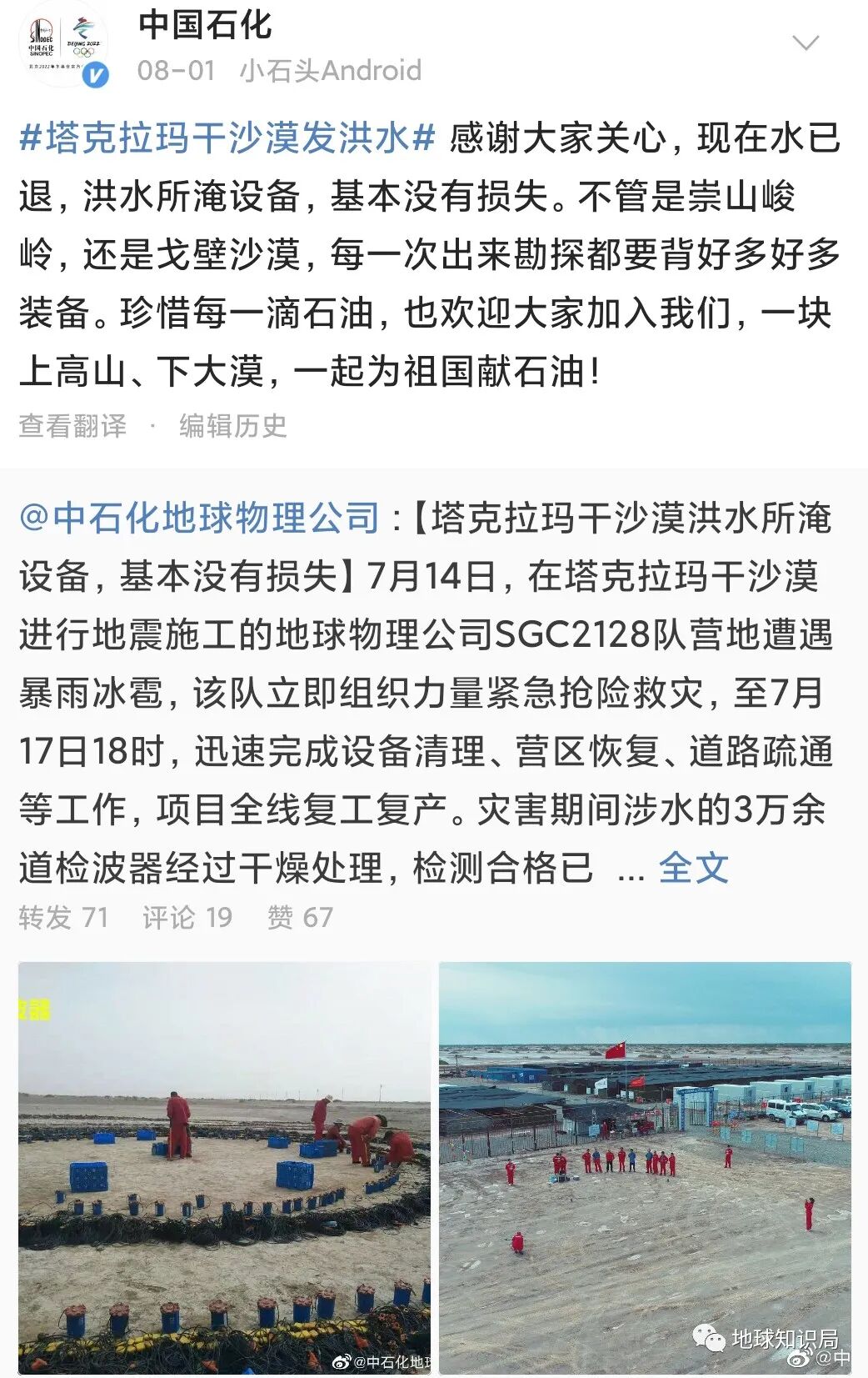 此次塔克拉玛干沙漠北缘发生洪水的主要原因,是天山南坡迪娜尔山二八台河上游山区发生了较强降雨,形成了小流域洪水。至于在当地作业的中石化,没有像网上说的那般损失巨大。实际上,石油部门包括地勘部门的损失有限,泡水的车辆和设备浸水时间不长,基本不影响使用。