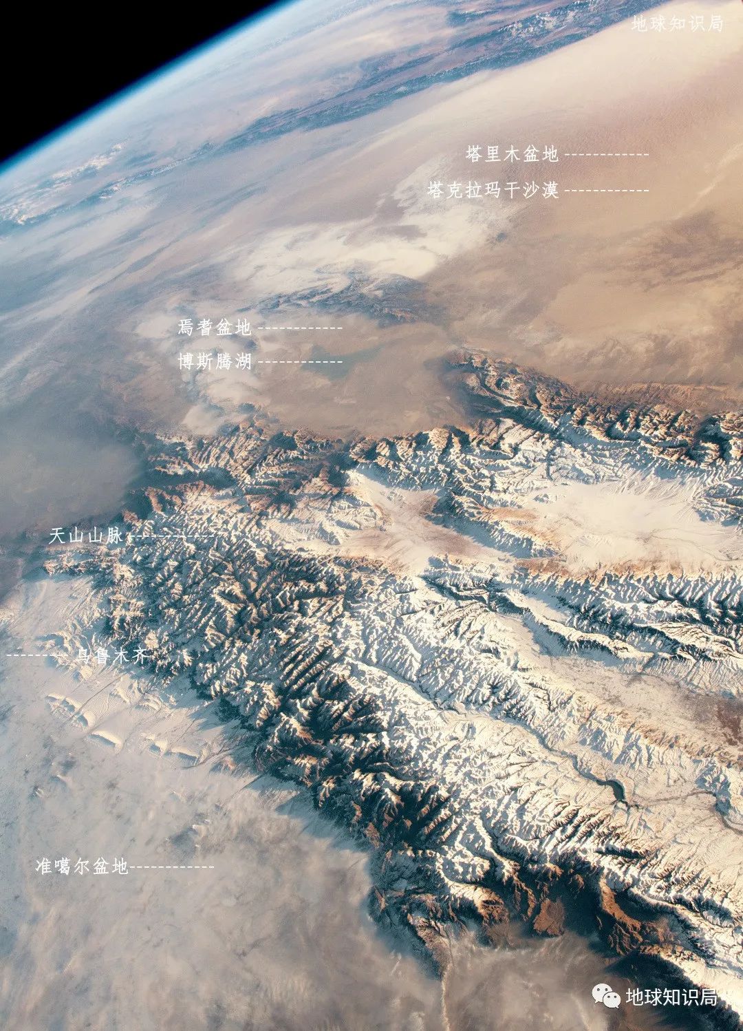 白雪皑皑的天山山脉与南边的沙漠形成了鲜明对比