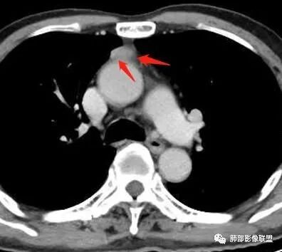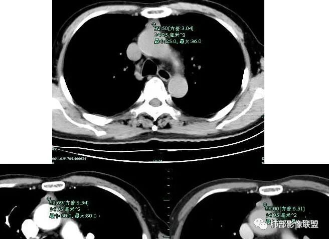 前纵隔结节灶,胸膜侧边缘平直内收,明显强化,但要除外容积效应,最好不同气相观察,除外囊肿。周太狼:前上纵隔占位,边缘光滑,软,密度均匀,中度强化,纵隔内余部位及双肺无明显异常。首先考虑胸腺瘤或胸腺增生,鉴别节细胞神经瘤。小兜:老年男性,体检发现前纵隔占位,边缘光整,密度较均匀,增强均匀轻度强化,右侧内乳血管增粗,考虑为良性病变,胸腺瘤可能。