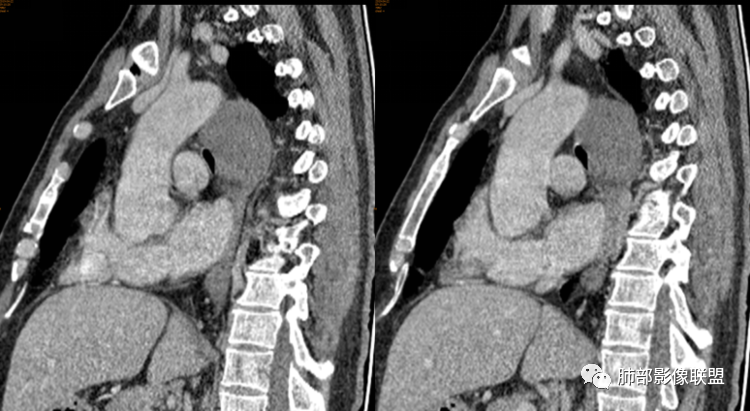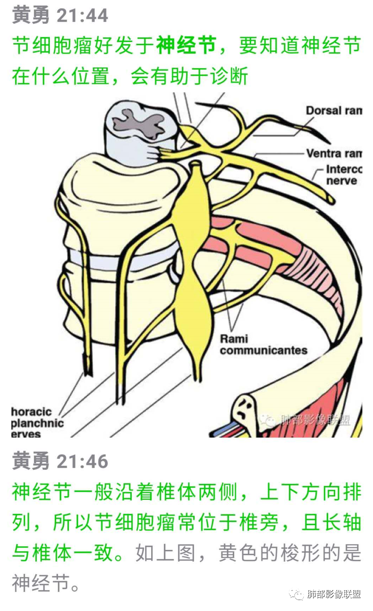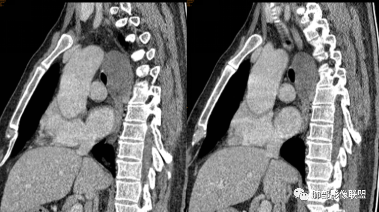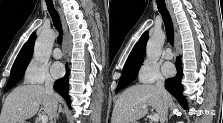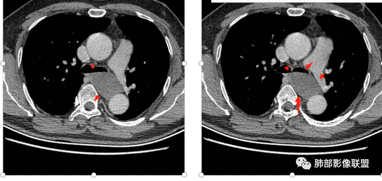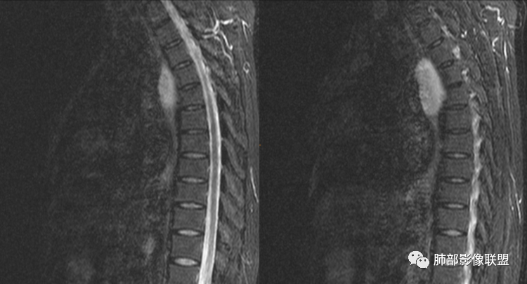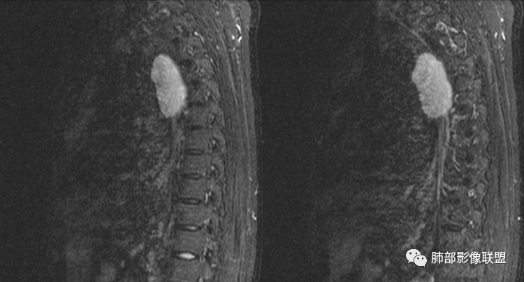 神经源性肿瘤:神经鞘瘤往往有包膜,有张力,典型的形态往往呈类圆形、“逗点形”或“哑铃型”横向延入某一椎间孔内;神经节细胞瘤虽然可以比较柔软,但是具有大量粘液基质,动静脉期强化不明显,延迟期由于粘液对造影剂的滞留,会出现渗透式轻度强化;神经源性肿瘤的解剖位置及形态很重要—沿神经干方向生长走行。后纵隔内神经鞘瘤最常见的是神经根出入椎间孔处,并可沿着肋间神经方向分布,所以后纵膈神经鞘瘤通常横径大,上下径小;神经节细胞瘤可沿着椎旁上下方向分布,所以表现为上下径相对长。