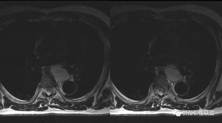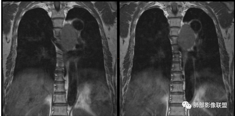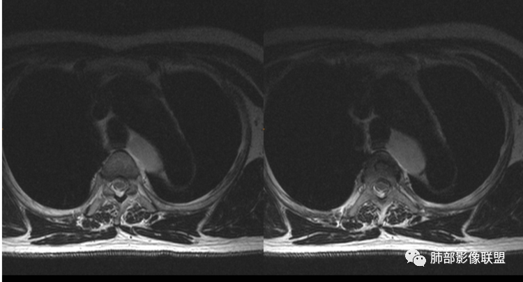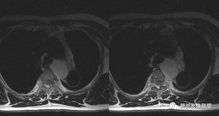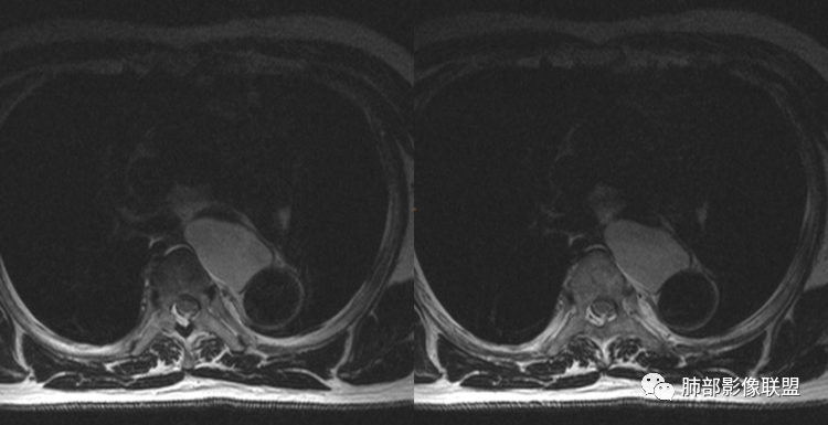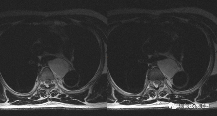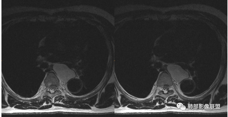左后纵隔食管旁占位,边界清晰,增强目测未见明显强化,稍长T1稍长T2信号,信号尚均匀,病灶较软,和食管紧贴,定性良性,首先考虑前肠囊肿,以支气管囊肿可能性大,鉴别节细胞瘤。