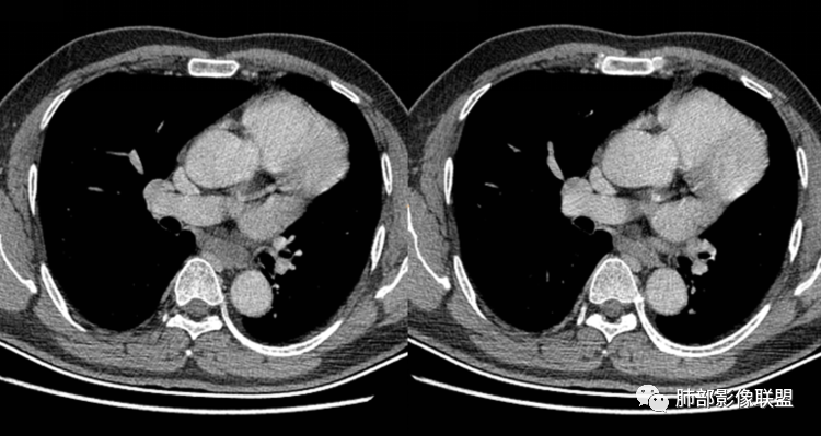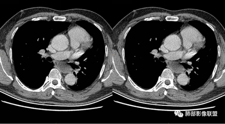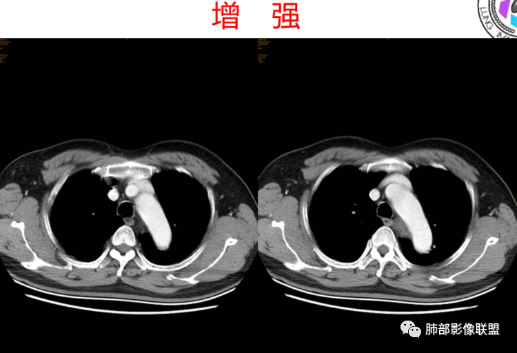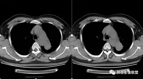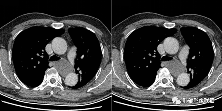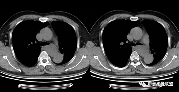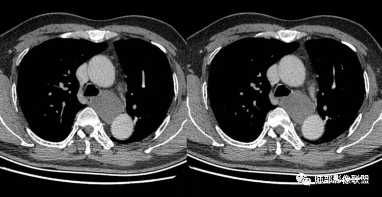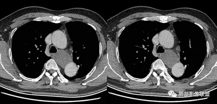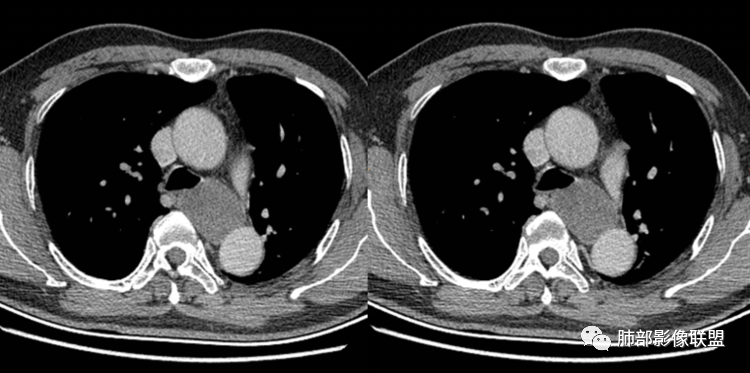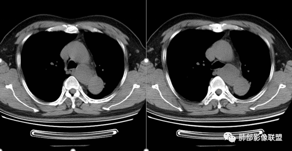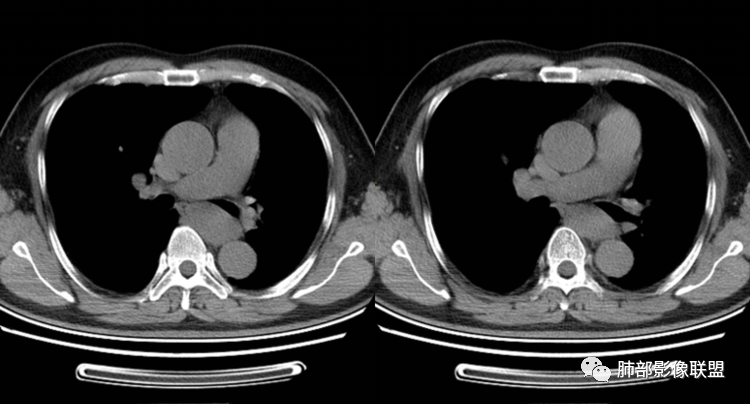 患者,男,43岁,无意间发现纵隔肿物,无胸闷胸痛,无心慌气短,无咳嗽,无吞咽困难等不适。体检发现的,无症状。