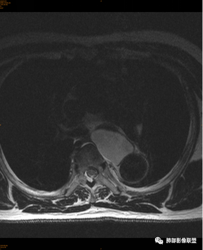 后纵隔占位;食道向右侧推移,病变质软,CT平扫密度均匀,边缘清晰光整,MRI 稍长T1,长T2高,脂肪抑制高信号。考虑纵隔良性囊性占位。先考虑支气管囊肿。其它类囊肿待除外。