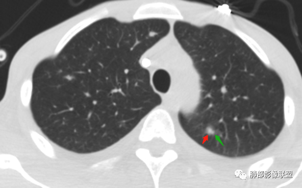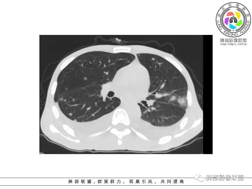 结节周围有磨玻璃影,随机分布。确实转移一般边缘比较干净,但是如果合并出血也可以出现磨玻璃。但是和斑片状如果一元,似乎不一样,放在后面待排