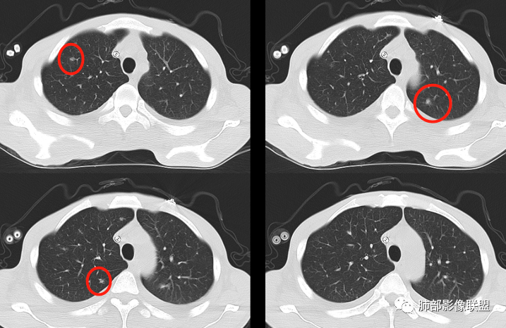 2、两肺多发结节,中上肺分布为主,结节边界尚清,部分边界平直
