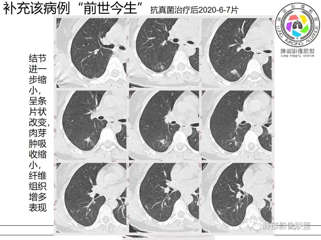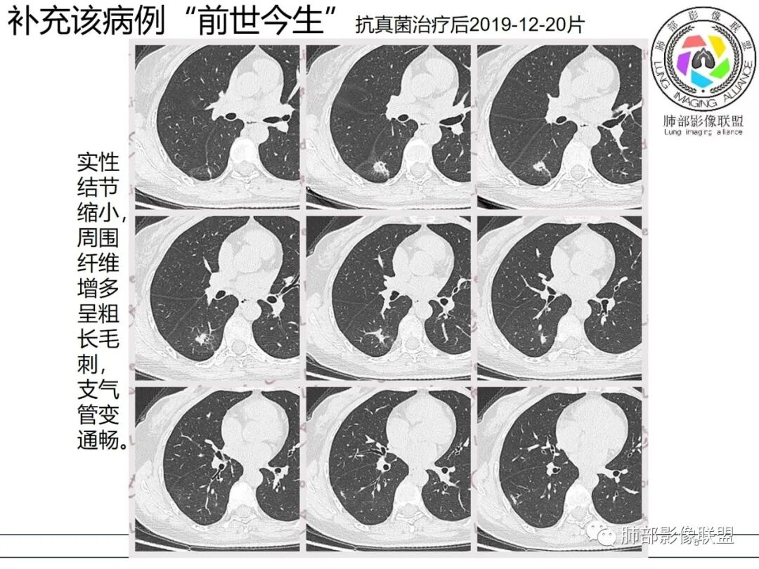 2、有些模糊晕消失慢的原因:隐球菌对周围肺组织破坏相对不重,周围所供应的营养不多,增殖也不快,呈局部相安无事的状态。隐球菌消灭之后,肺泡间隔的炎症细胞及间质恢复更慢,所以经常能见到隐球菌外面隐约带细丝的模糊影。