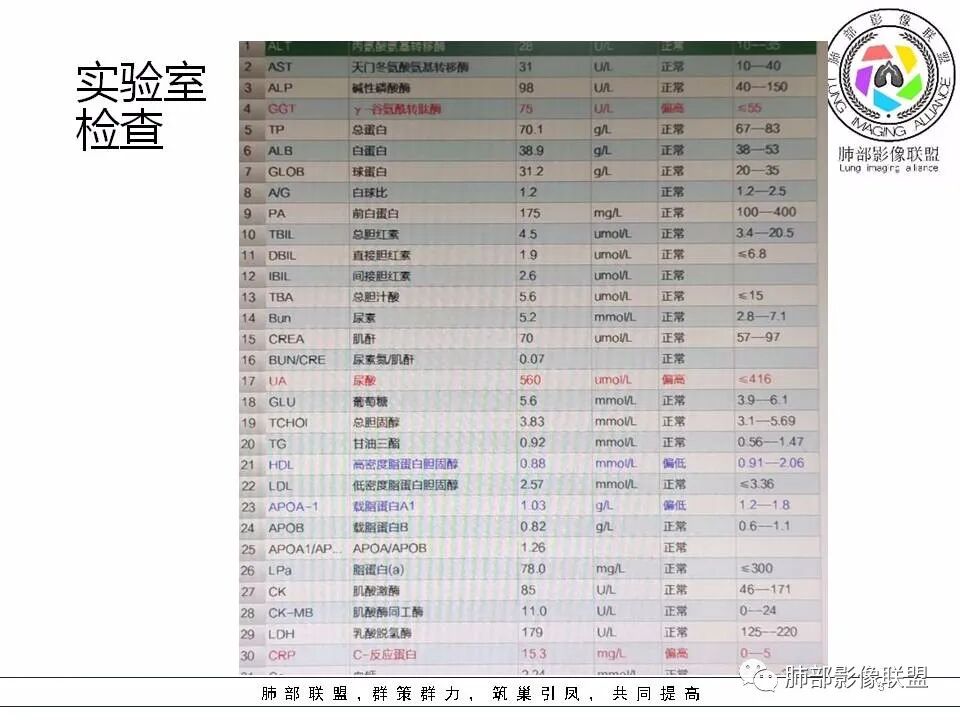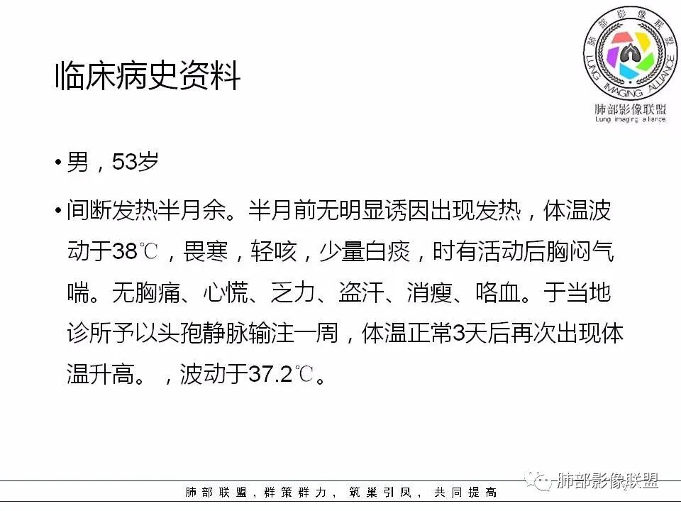间断发热半月余。半月前无明显诱因出现发热,体温波动于38℃,畏寒,轻咳,少量白痰,时有活动后胸闷气喘。无胸痛、心慌、乏力、盗汗、消瘦、咯血。于当地诊所予以头孢静脉输注一周,体温正常3天后再次出现体温升高。波动于37.2℃。实验室检查没有太多的问题。左肺下叶囊腔病变,壁比较薄,部分环壁局限性的增厚,边界毛糙,略显模糊,并见与支气管相连,未见明显的壁结节,而囊壁内见丝丝缕缕的索状影。考虑良性病变,毛霉菌感染或隐形性感染,鉴别寄生虫肺部感染。