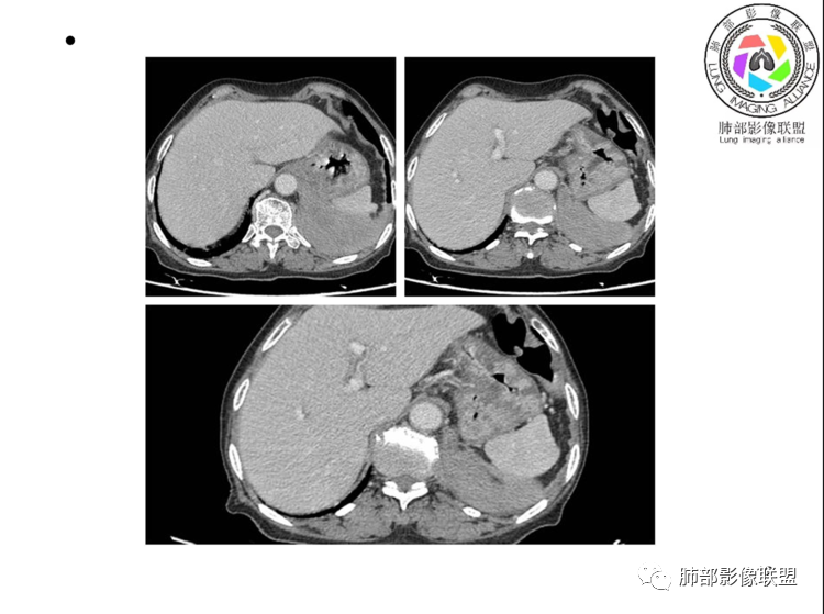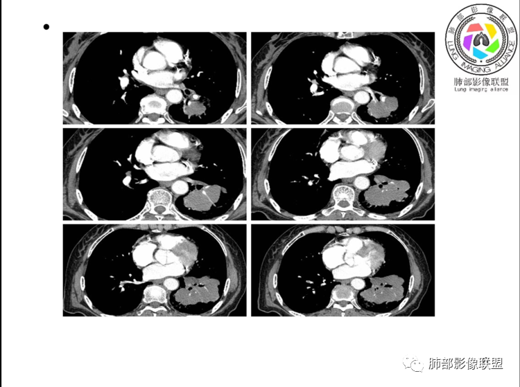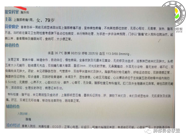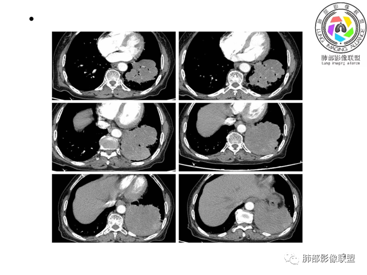老年女性,以上腹痛就诊,左肺下叶团块影,边界清,可见分叶,延迟强化,内未见明显坏死,可见支气管充气扩张,血管走形自然,考虑淋巴瘤