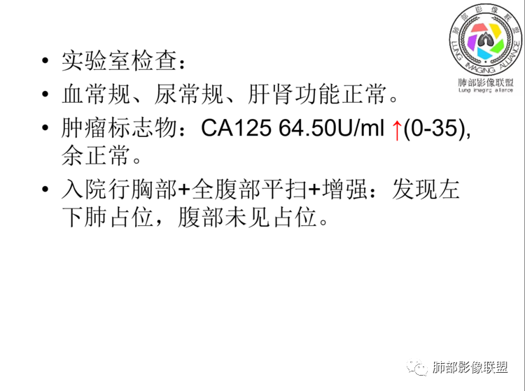 患者老年女性,上腹部疼痛一周,无呼吸道症状,查体无阳性体征。血常规、尿常规、肝肾功能正常。肿瘤标志物CA125稍升高。胸部CT:左肺下叶肿块灶,边缘欠光滑,边界欠清楚,见分叶、血管集束征象,内见支气管扩张,增强中度强化,见血管漂浮征象。综合考虑恶性病变,淋巴瘤可能大,鉴别肺癌。