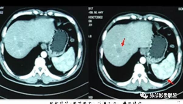 脾大,肝内结节中央似有点状血管通过,炎性可能