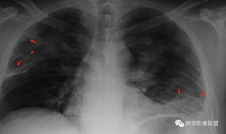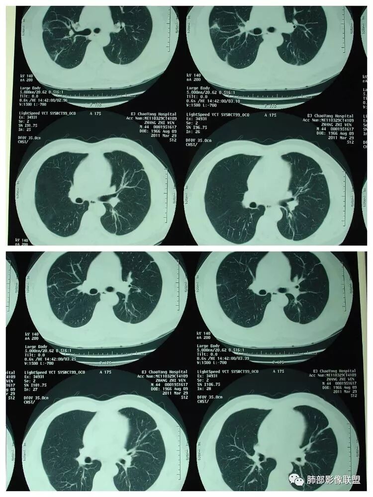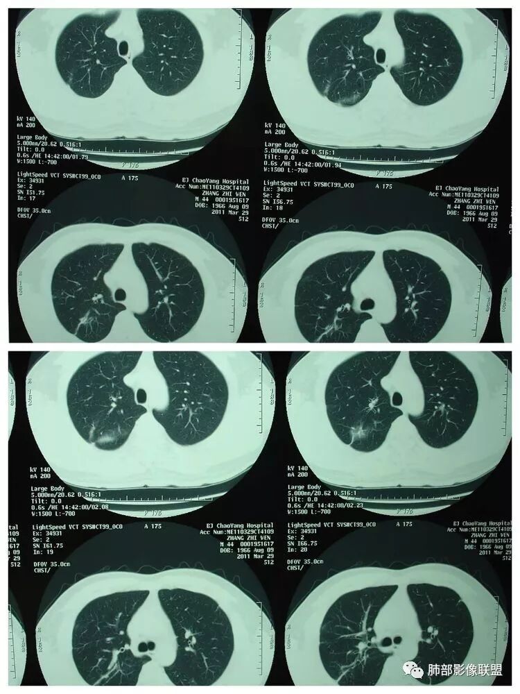 肺克的影像表现(唐绍宏总结):分布:单侧上叶病变,以右肺上叶多见;患者长期卧床则双脚下肺后基底段分布(国外下肺多见,可能与平均寿命长,卧床及住托老机构多有关) ;如多叶段病变,则以肺上叶后段或下叶后基底段为最明显形态:气管壁增厚、磨玻璃、小叶实变、节段实变、大叶实变,坏死小空洞(直径小于2cm) ,少量胸腔积液50%、脓胸20%特点:早期气管壁增厚较明显、广泛,越靠近病灶越明显,越靠近肺门越明显,见于实变病灶外,偶尔见于磨玻璃影内(支气管通气征) ;未经抗生素治疗,实变病灶内无支气管通气征;早期即可出现坏死,无论坏死还是空洞,绝大多数直径小于2cm (可能与此菌有厚夹膜有关,参考隐球菌)