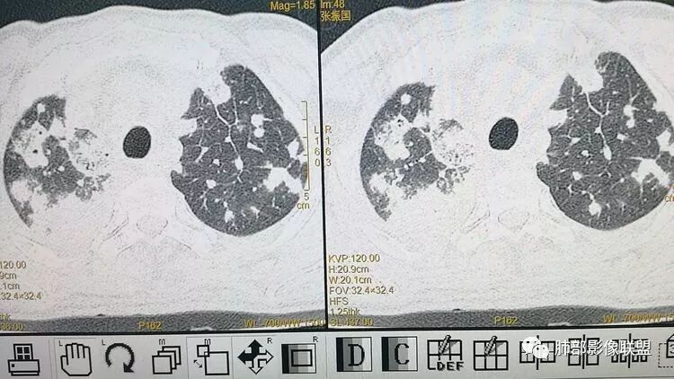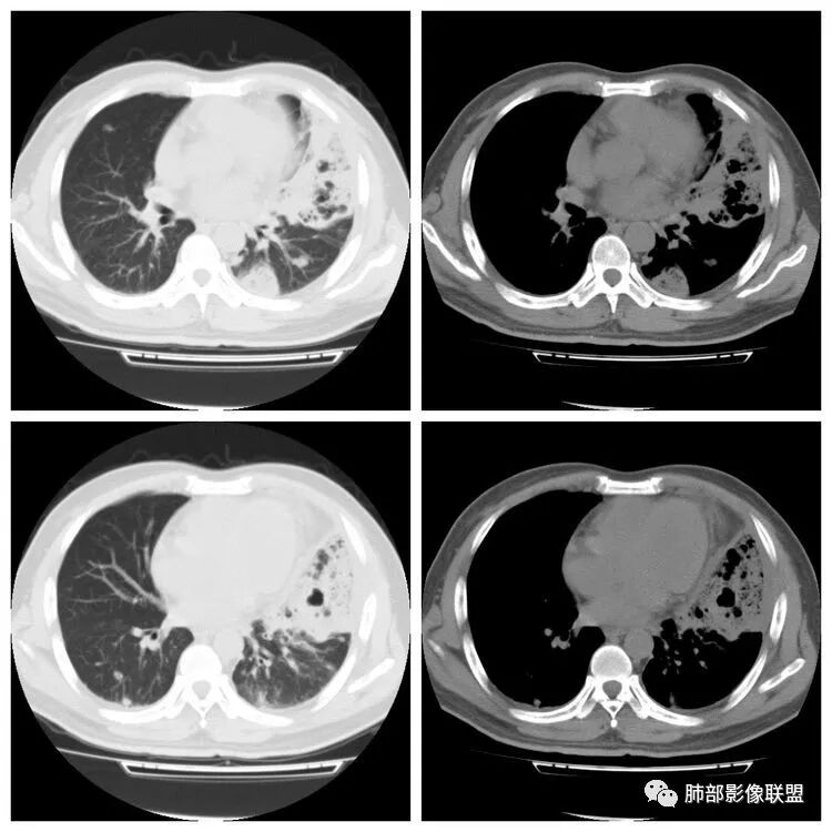 王秀仙:双肺多发结节及结块影,边缘清晰,呈反晕征,左肺上叶大片实变,密度不均,下缘膨隆,其内可见残留肺组织,肝脏可见低密度,考虑肺克。鉴别毛霉。崇军:高热,感染症状,影像多发结节,反晕征明显,糖尿病,真菌放在第一位,杰克金毛,毛霉菌可能。Yiren Sishui(厶水伊人):肺克,鉴别毛霉菌感染;一米阳光:中年男性,急性起病,双肺散在结节状及斑片状高密度影,以胸膜下明显,没有坏死,密度不均,考虑血播来源,肺克可能,鉴别,金葡,曲霉毛勤香:双肺多发结节斑片状影,呈反晕征,左肺上叶舌段大片状影,叶间裂下坠,糖尿病患者,急性起病,考虑感染性变,首先肺克,代排真菌类曲霉毛霉等,肝脏也有病灶,一元论。小景:糖尿病、肝脓肿?肺内多发结节,反晕,与血管关系密切。考虑肺克。