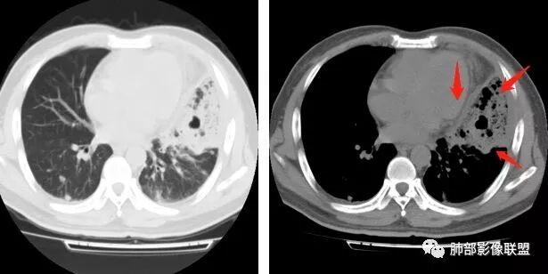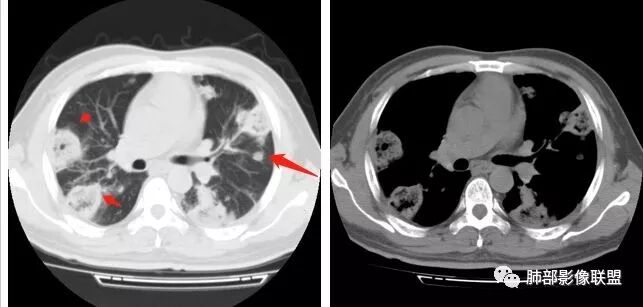 南边:胸膜下,类圆形,边界清,内有坏死,典型的反晕征,支气管壁增厚不明显,支持血道来源脓毒栓子所致梗死、感染