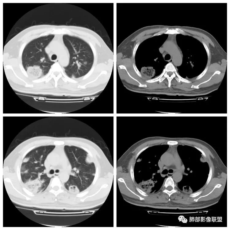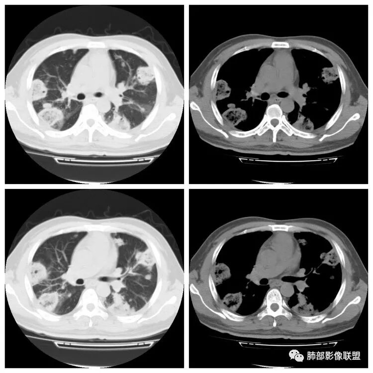 玫:双肺内及胸膜下多发簇壮病灶及小结节影,左肺上叶见实变影,考虑感染性病变可能。导管冯:两肺外围分布多发楔形影,病灶来源于血管,考虑感染性病变,糖尿病史,真菌感染可能性大;小微:糖尿病病史,金毛结克,肺内多发结节,结节内见丝状物,反晕征,与血管关系密切,考虑霉菌感染。结合肝脏病变,待除外肺克。山河:有糖尿病史,支持真菌累感染,肺内多发结节呈反晕征样改变;若尘:两肺多发结节,反晕,糖尿病史,首先考虑毛霉,鉴别肺克,肝脏病灶图像增强不像脓肿,可惜没静脉和延迟期