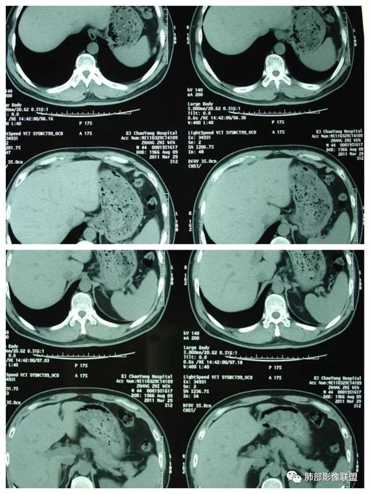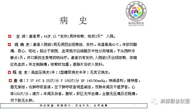 南边:患者男,44岁,以“发热1周伴咳嗽、咳痰3天” 入院。现 病 史:患者入院前1周无诱因出现寒战、发热,体温最高410C,伴肌肉酸痛、恶心、呕吐,就诊于我院, 血常规示白细胞及中性分类增高,予头孢呋辛静点1天,并口服抗生素等药物治疗。患者仍有发热,入院前3天出现咳嗽、咳暗红色血痰,伴左侧胸痛,咳嗽时加重,查胸片后收入我科。初学者:就是脓肿的话,也是坏死。然后肉芽肿边缘的壁;早期的话,它不会形成那种中央坏死壁强化的这种典型表现,但是它的特点是它很快会变化,所以有的时候不是很确定的时候,可以看那个随访。有没有高热,一般会这样判断是不是囊肿。但这个人因为肺部本身有病变,所以说,肝内的这个病变就没有办法鉴别了,那可以看一下他随访有没有变化,这个可以判断囊肿,就是从CT上它的这个壁,有的时候不是很好看,尤其是他脓肿,它形成的话,它有几个期。期不一样,它的壁的厚度、中间的坏死都不一样,所以有的时候它并不是特别的均匀,一般囊肿的话呢,我们会觉得它的分界跟周围的分解和非常的清楚,因为囊肿它是真壁。