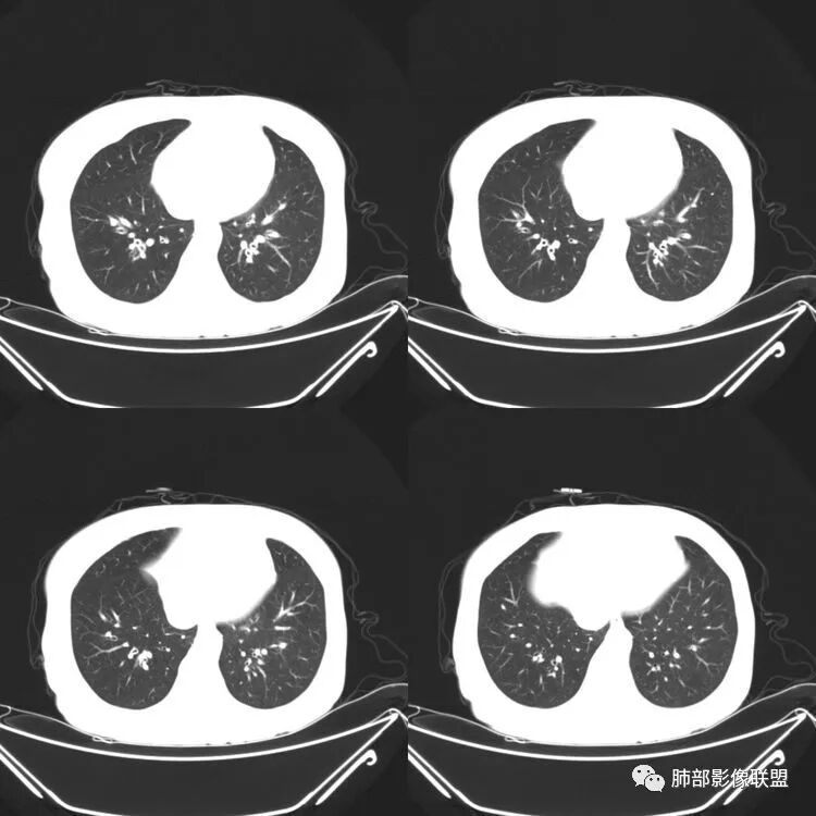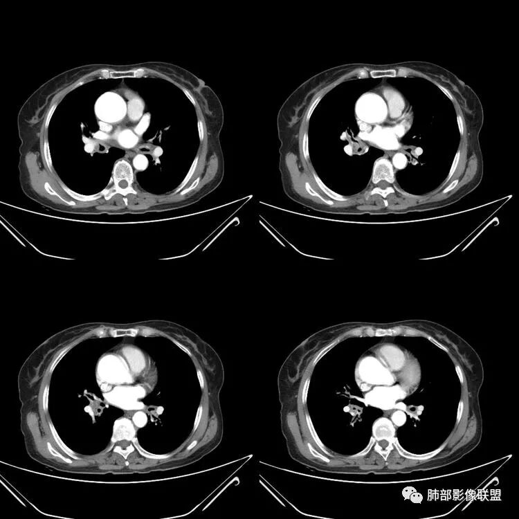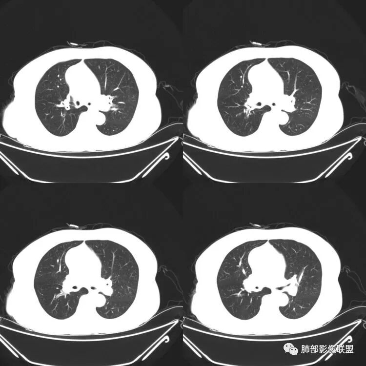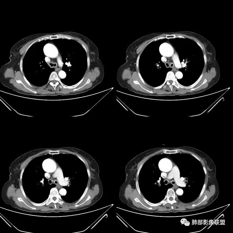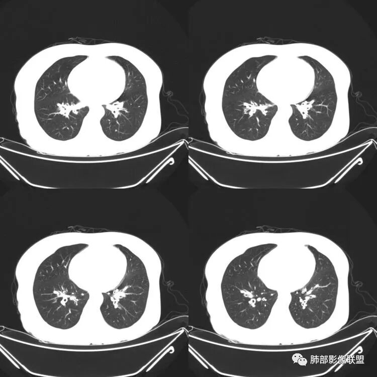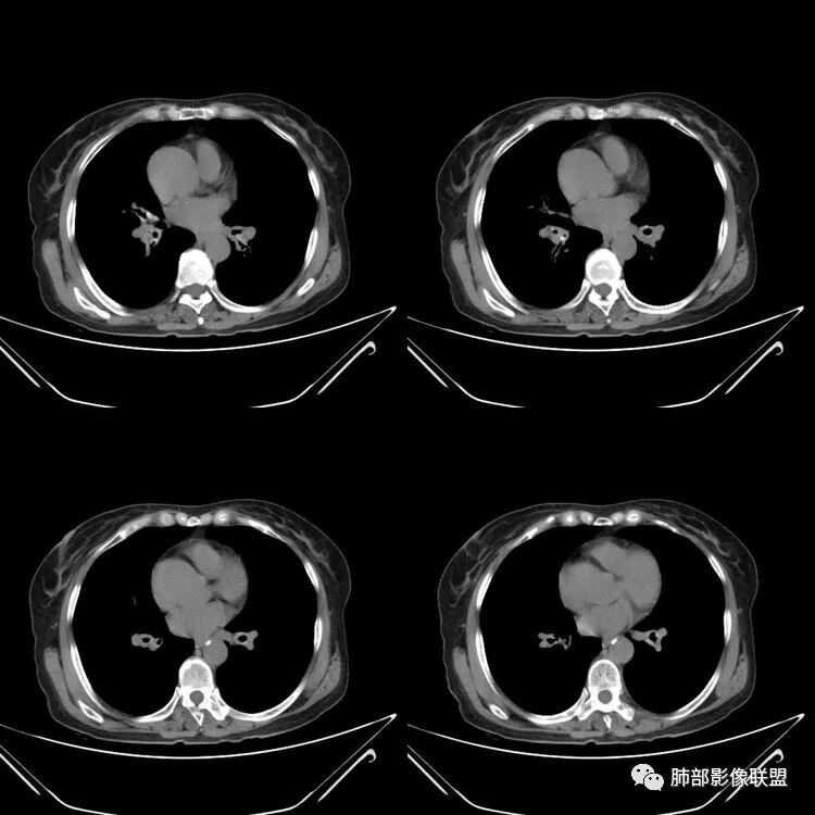 患者,女,64岁,反复咳嗽、咳痰、胸闷10年,加重2周。气管支气管及两肺下叶 支气管弥漫性的环状增厚,管腔扩张,管腔感觉比较松弛。第一感觉,气管支气管淀粉样变。鉴别诊断,1、支气管内膜结核,肺内散在一些支气管的播散病灶,粟粒结节为主,形态比较单一。2、复发性的多软骨炎,就得了解一下其他部位,有没有多个部位的软骨炎。这个病人右侧胸廓缩小,升主动脉明显的扩张,其横径明显的超过了降主动脉。
