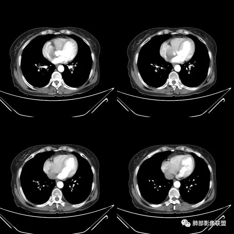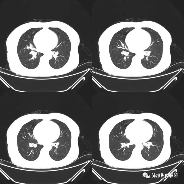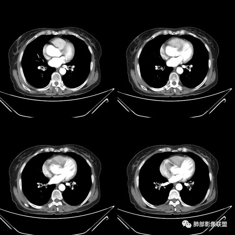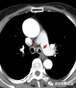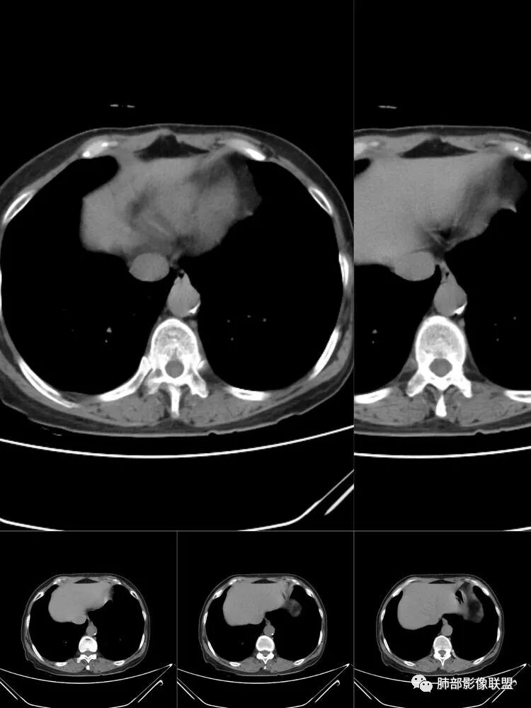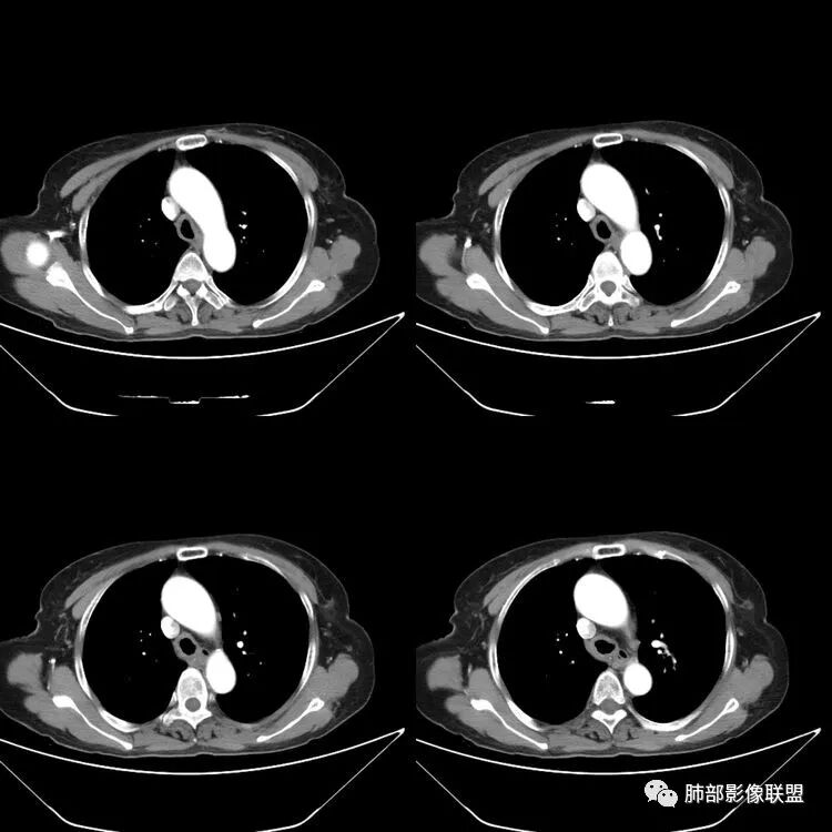 患者,女,64岁,反复咳嗽、咳痰、胸闷10年,加重2周。气管支气管及两肺下叶 支气管弥漫性的环状增厚,管腔扩张,管腔感觉比较松弛。第一感觉,气管支气管淀粉样变。鉴别诊断,1、支气管内膜结核,肺内散在一些支气管的播散病灶,粟粒结节为主,形态比较单一。2、复发性的多软骨炎,就得了解一下其他部位,有没有多个部位的软骨炎。这个病人右侧胸廓缩小,升主动脉明显的扩张,其横径明显的超过了降主动脉。