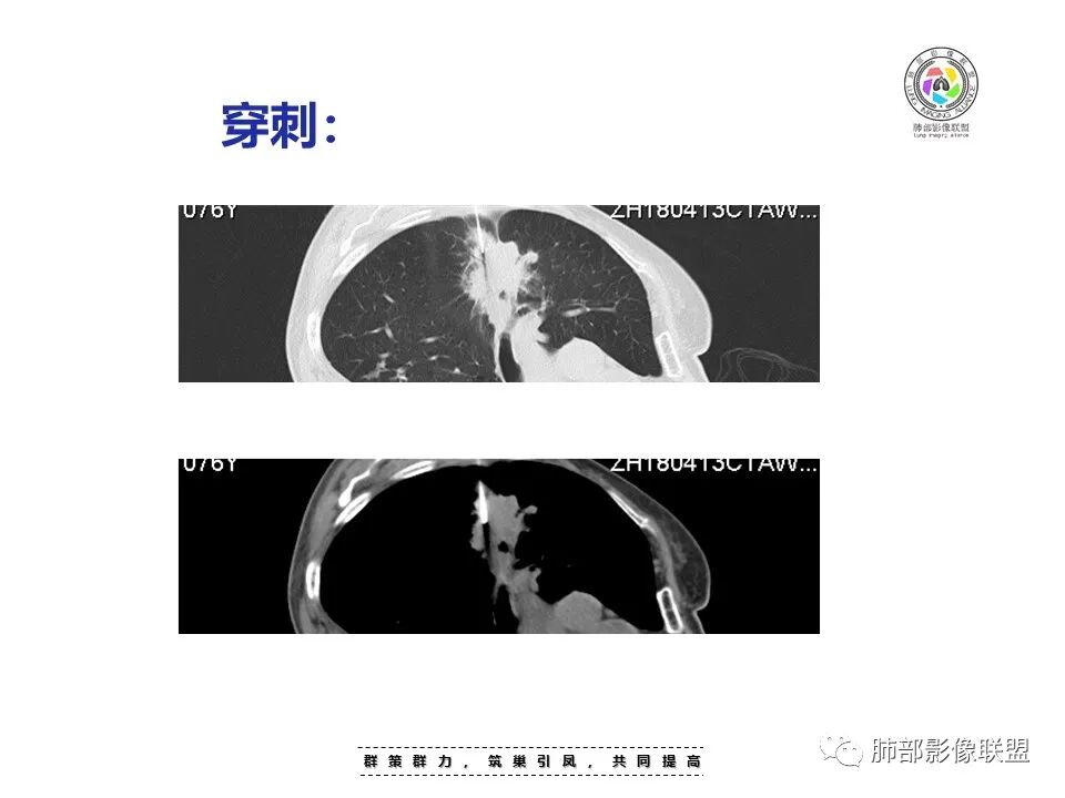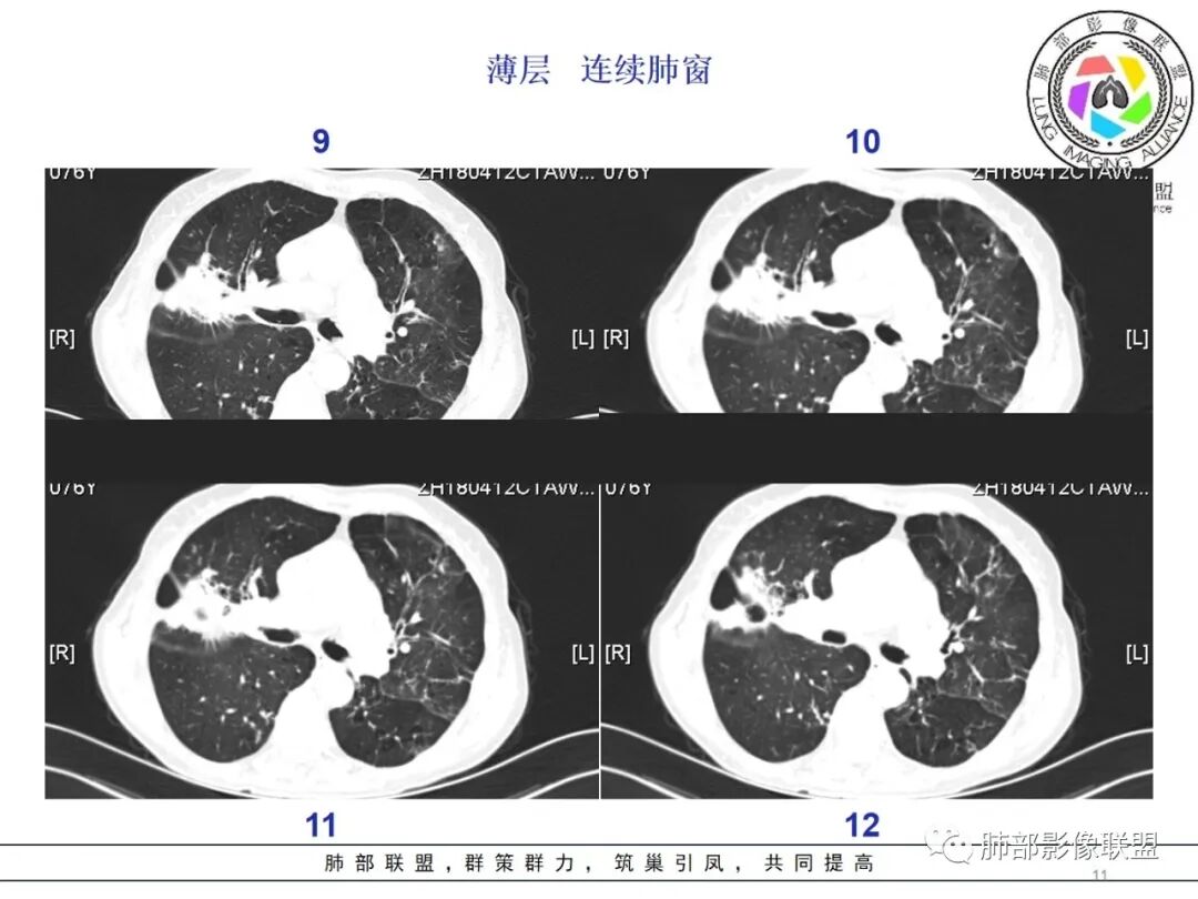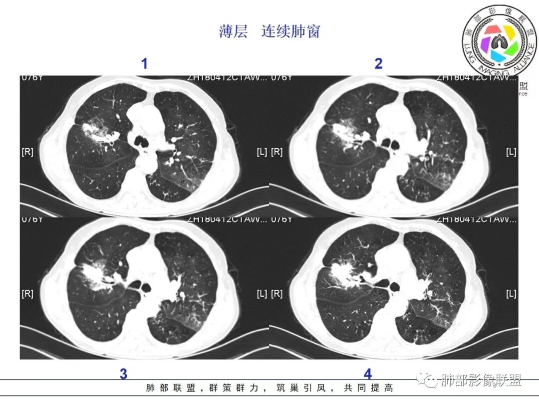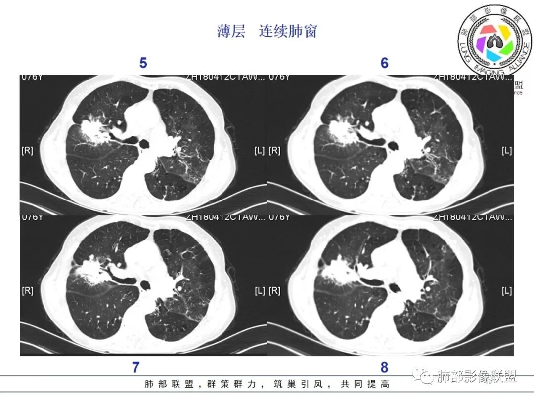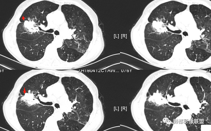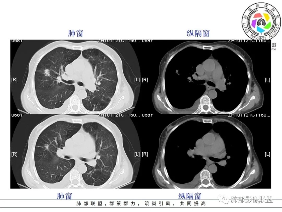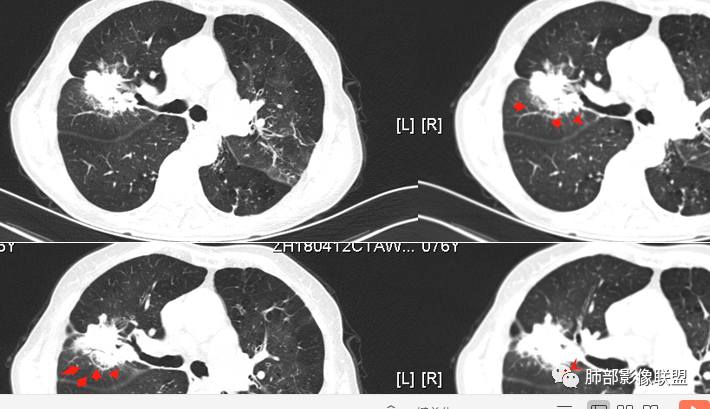 蓝天白云: 老年女性,右肺上叶不规则肿块,月牙铲,有收缩,分叶,毛刺,边缘清晰的磨玻璃影,上叶后段支气管截断,胸膜牵拉凹陷,不均匀延迟强化,内见空泡,纵隔淋巴结增大,IAC。所以的恶性征象都有了