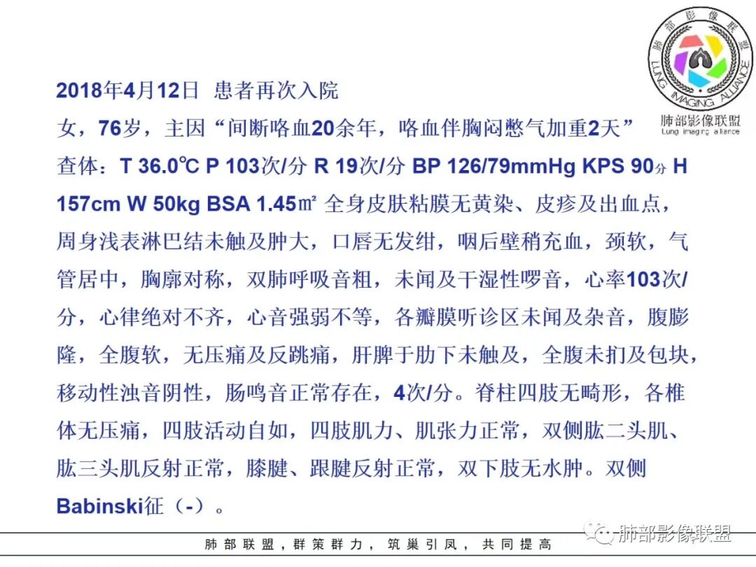 王开金江津中心医院呼吸科: 老年女性,痰血,右肺新生物,毛刺,分叶,胸膜凹陷,支气管截断,空炮,周围有部分磨玻璃,淋巴结肿大,结合肿瘤标志物升高,考虑肺恶性肿瘤,倾向腺癌。鉴别结核。