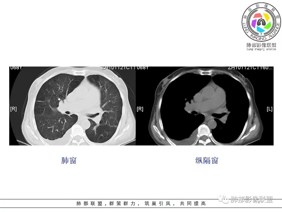 红星: 女性68岁,右肺上叶前段结节,将近7年的时间明显长大,表现出分叶毛刺及支气管截断伴胸膜凹陷,增强明显的不均匀强化,纵隔内多发的淋巴结肿大。左肺多发的斑点及条索状间质改变。考虑右肺上叶前段恶性病变,腺癌的可能性大。鉴别诊断结核或炎性肉芽肿。