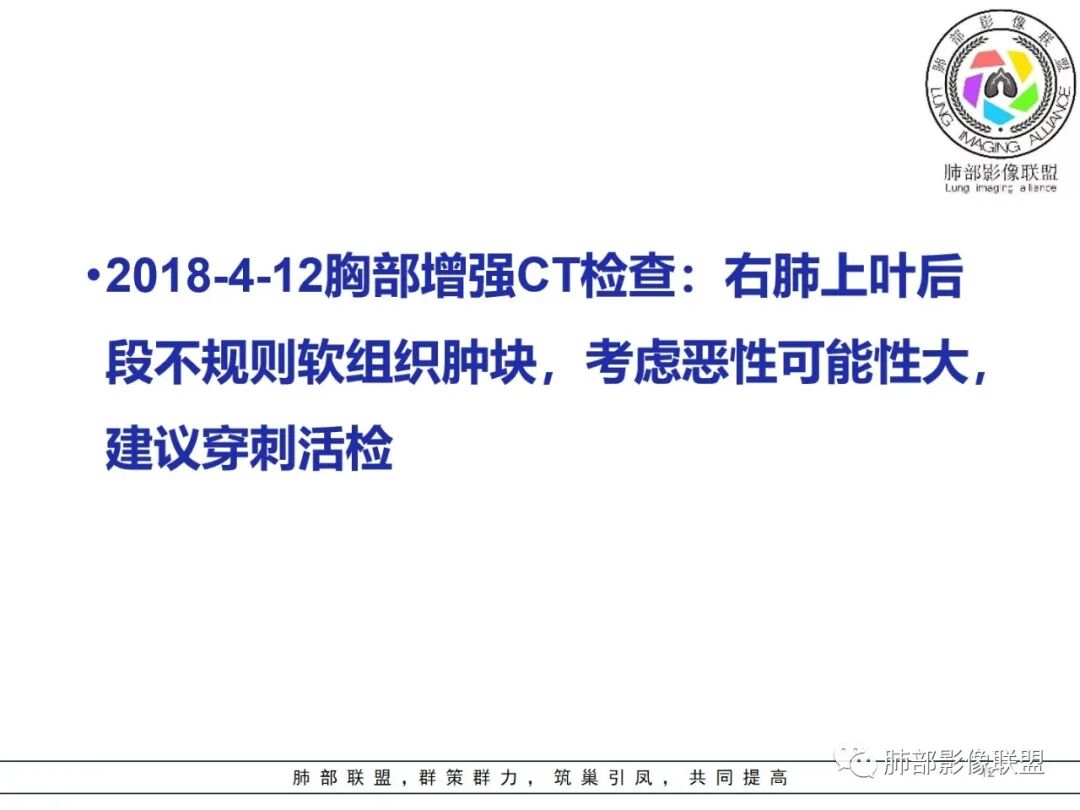 丽: 病灶八年明显增大,右肺上叶不规则肿块,边缘毛刺、分叶,胸膜牵拉,并可见清晰磨玻璃密度影,临近支气管截断,增强后不均匀强化,内可见多发低密度,纵膈肿大淋巴结,考虑恶性,常规考虑腺癌