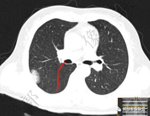 2、影像所见:右肺上叶后段混合密度磨玻璃影mGGN,整体膨隆为主,局部收缩,局部边缘可疑月牙铲。周围磨玻璃影边界清楚,边缘分叶,细细观察这种清楚的弧形边界,与小叶间隔是否高度契合?!